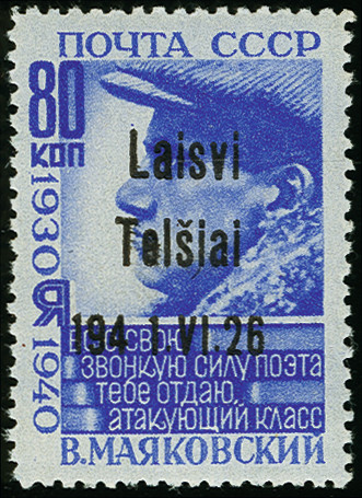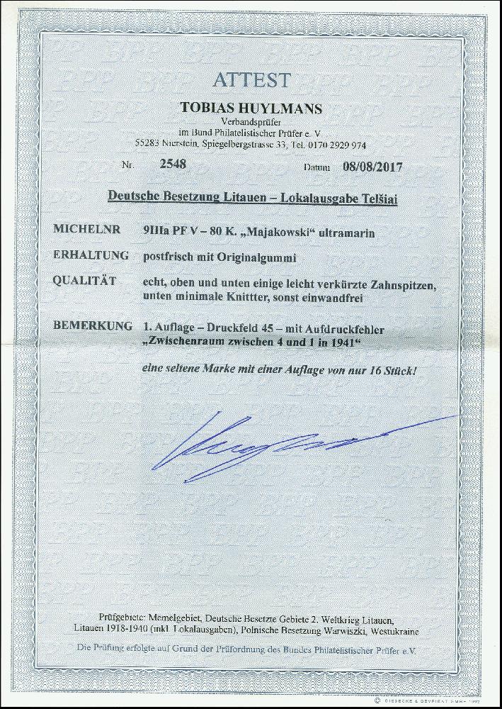 | Zusatzinformationen und Suchstichworte: | 366. Auktion Heinrich Köhler Auktionstermin 19.-24.03.2018 Los 2224 TELSIAI: Majakowski 80 K. mit Aufdruckfehler "weiter Abstand zwischen 194 und 1", postfrisch, einige verkürzte Zähne, sonst tadellos, eine sehr seltene Marke mit einer Auflage von nur 16 Stück, Fotoattest Huylmans BPP (2017) Zuschlag 3.400,00 EUR |