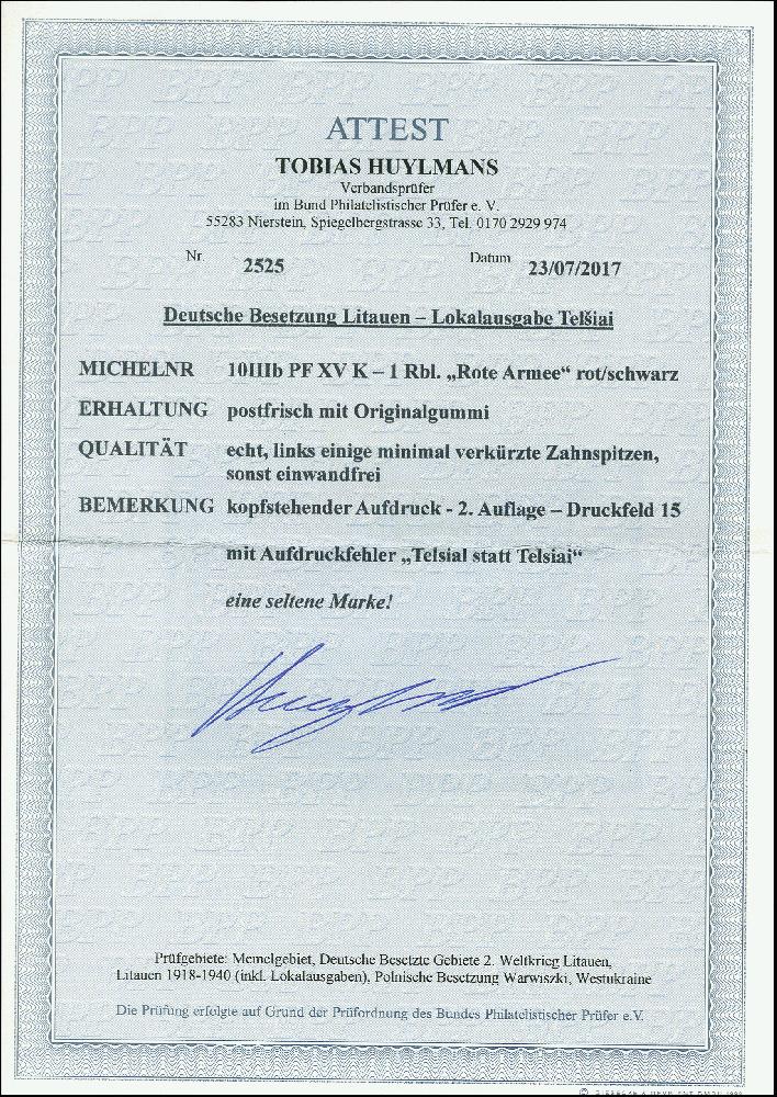 | Zusatzinformationen und Suchstichworte: | 366. Auktion Heinrich Köhler Auktionstermin 19.-24.03.2018 Los 2225 Rote Armee 1 Rbl. mit kopfstehendem Aufdruck in Type IIIb und Aufdruckfehler "Telsial statt Telsiai", postfrisch, links minimal verkürzte Zahnspitzen, sonst tadellos, eine sehr seltene Marke, Fotoattest Huylmans BPP (2017) Zuschlag 550,00 EUR |