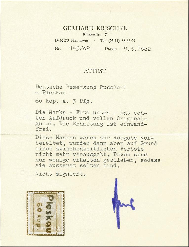| Zusatzinformationen und Suchstichworte: | 366. Auktion Heinrich Köhler Auktionstermin 19.-24.03.2018 Los 2245 "PLESKAU 60 Kop." auf Hindenburg 3 Pfg., sauber ungebraucht, tadellos, eine sehr seltene Marke, Fotoattest Krischke (für postfrisch) (2002) (Mi. 1.800,-) Zuschlag 700,00 EUR |