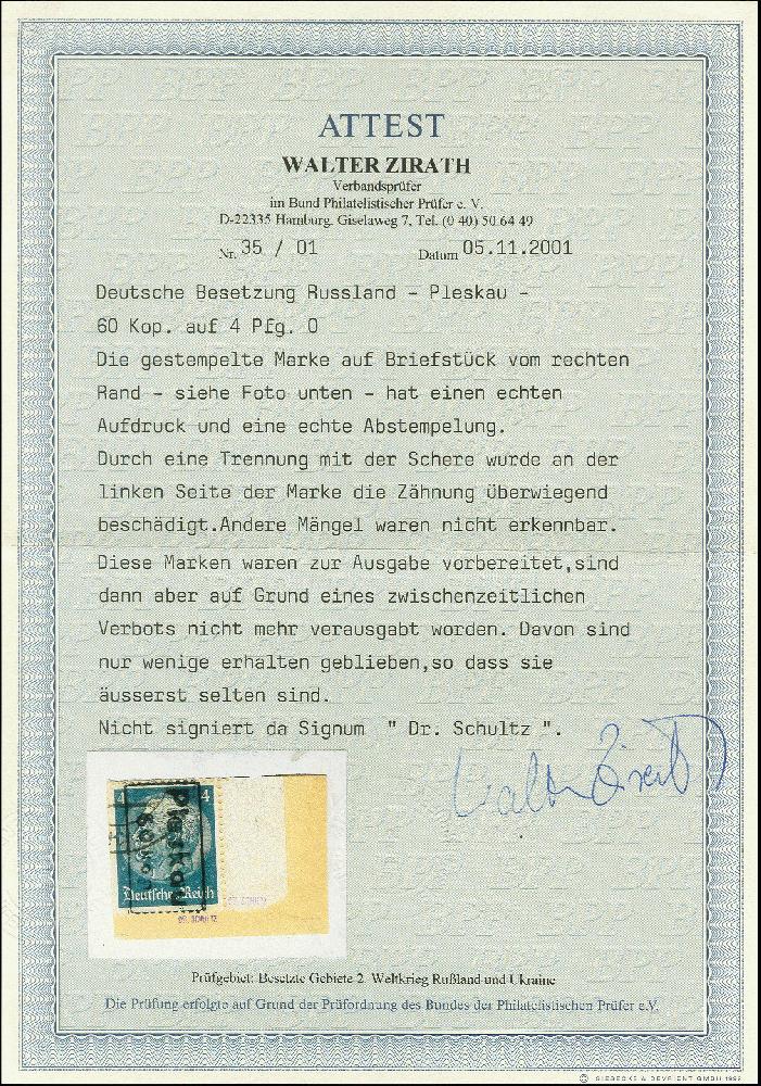 | Zusatzinformationen und Suchstichworte: | 366. Auktion Heinrich Köhler Auktionstermin 19.-24.03.2018 Los 2246 "PLESKAU 60 Kop." auf Hindenburg 4 Pfg., sauber mit Stempel auf Briefstück, links meist Scherentrennung, sonst tadellos, eine äußerst seltene Marke, sign. Dr. Schultz und Fotoattest Zirath BPP (2001) Zuschlag 650,00 EUR |