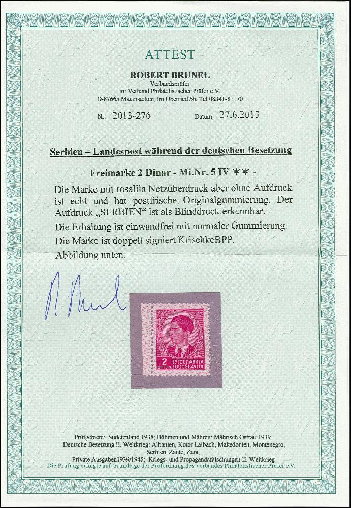 | Zusatzinformationen und Suchstichworte: | 366. Auktion Heinrich Köhler Auktionstermin 19.-24.03.2018 Los 2258 2 D. mit linkem Bogenrand, der Aufdruck "SERBIEN" nur im Blinddruck, postfrisch, tadellos, sign. Krischke BPP und Fotoattest Brunel (2013) Ausruf 100,00 EUR |