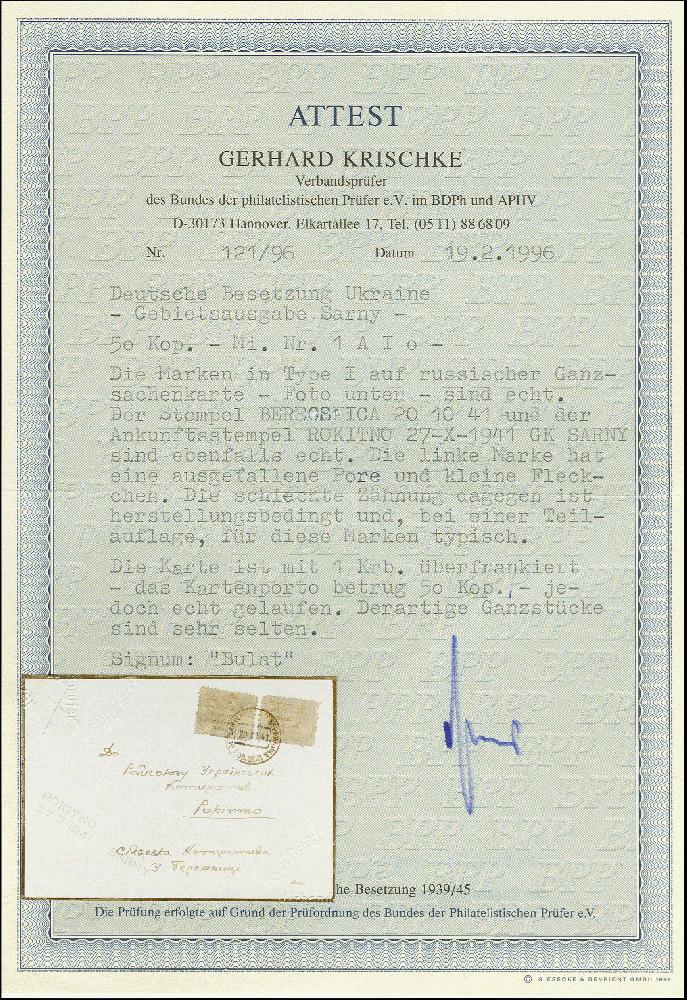 | Zusatzinformationen und Suchstichworte: | 366. Auktion Heinrich Köhler Auktionstermin 19.-24.03.2018 Los 2272 50K. schwarz auf dunkelblau, zwei Einzelwerte mit Stempel "BEREGSNICA 20 10 41" auf Karte nach Rokitno mit Ankunftsstempel, die linke Marke mit kleinen Fleckchen und ausgefallenem Sandkorn, sonst in tadelloser Erhaltung, selten, sign. Bulat und Fotoattest Krischke BPP (1996) Zuschlag 240,00 EUR |