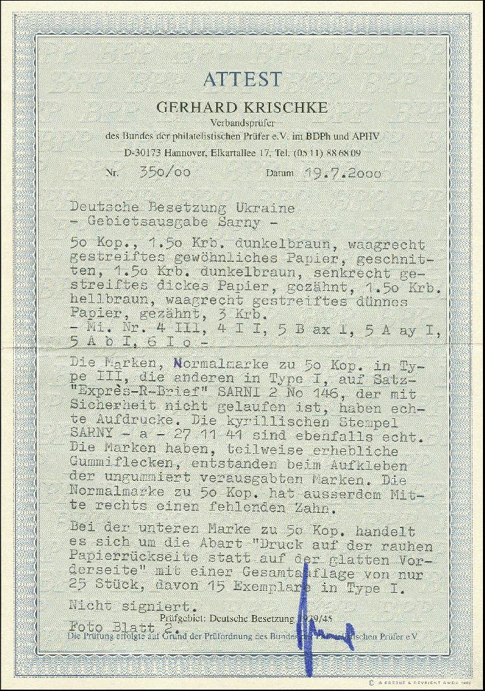 | Zusatzinformationen und Suchstichworte: | 366. Auktion Heinrich Köhler Auktionstermin 19.-24.03.2018 Los 2275 50 K. schwarz auf dunkelblau mit Druck auf der rauhen Papierrückseite mit Zufrankatur mit Stempel "SARNI 27 11 41" auf Express-R-Brief, teils etwas Gummifleckig, einige Wert der Zufrankatur mit Einschränkungen, sonst tadellos, die Auflage der Marke mit Druck auf der Rückseite beträgt nur 25 Stück, davon 15 Exemplare in Type I, Fotoattest Krischke BPP (2000) Zuschlag 600,00 EUR |