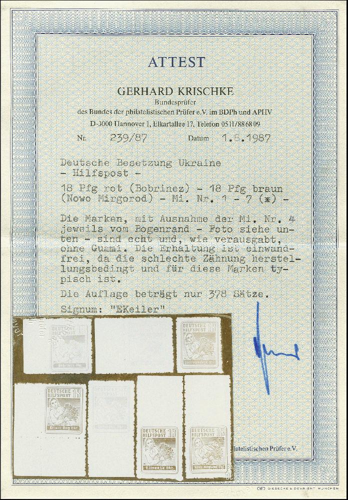 | Zusatzinformationen und Suchstichworte: | 366. Auktion Heinrich Köhler Auktionstermin 19.-24.03.2018 Los 2277 Südukraine: 1944, 7 Werte komplett, ohne Gummi wie verausgabt, tadellos, Fotoattest Krischke BPP (1987) (Mi. 2.200,-) Zuschlag 850,00 EUR |