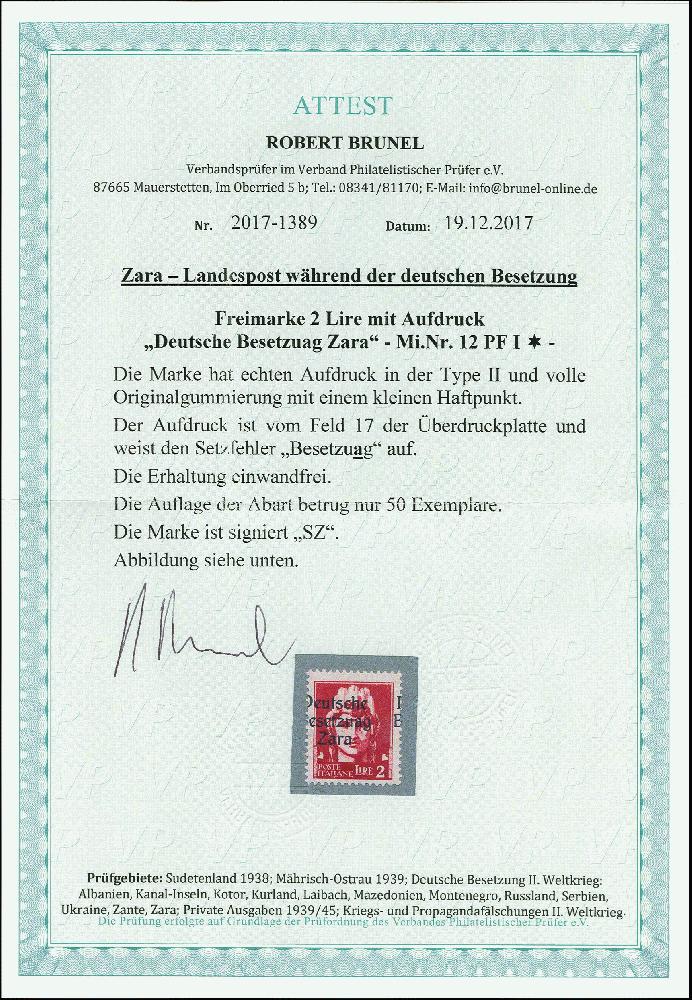 | Zusatzinformationen und Suchstichworte: | 366. Auktion Heinrich Köhler Auktionstermin 19.-24.03.2018 Los 2286 2L. mit leicht verschobenem Aufdruck mit Aufdruckfehler "Besetzuag", sauber ungebraucht, tadellos, die Auflage dieser Abart beträgt nur 50 Stück, sign. SZ und Fotoattest Brunel (2017) Ausruf 180,00 EUR |