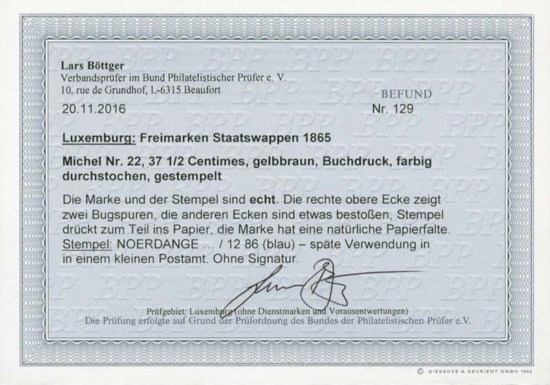 | Zusatzinformationen und Suchstichworte: | Provenienz: Sammlung Simonis Stempeldatum 1880 der Paketpostagentur von Noerdange. Die Marke ist oxidiert und dadurch verdunkelt, entspricht außer an einigen kleinen Stellen nicht mehr der Originalfarbe. Die Marke besaß ursprünglich den Aufdruck "UN FRANC". Reste der schwarzen Farbe sind noch erkennbar (Detailfoto). Des Weiteren erkennt man an der Stelle wo sich ursprünglich der Aufdruck befand, deutlich eine Papieraufrauhung, die von einer Radierung stammt. Es wurde primitiv versucht, eine Michel-Nr. 25 in eine 22 umzuwandeln. Die Paketpostagentur in Noerdange eröffnete im Juli 1880. Die Michel-Nr. 22 wurde bereits Ende 1872 mit dem Aufdruck versehen und wurde demnach nie nach Noerdange geliefert. Dies ist die früheste bekannteste Abstempelung von diesem Ort. |