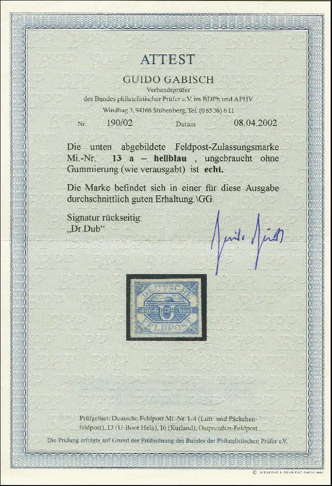| Zusatzinformationen und Suchstichworte: | 366. Auktion Heinrich Köhler Auktionstermin 19.-24.03.2018 Los 2300 1945, U-Boot Hela hellblau, ohne Gummi wie verausgabt, tadellos, sign. Dub und Fotoattest Gabisch BPP (2002) Zuschlag 240,00 EUR |