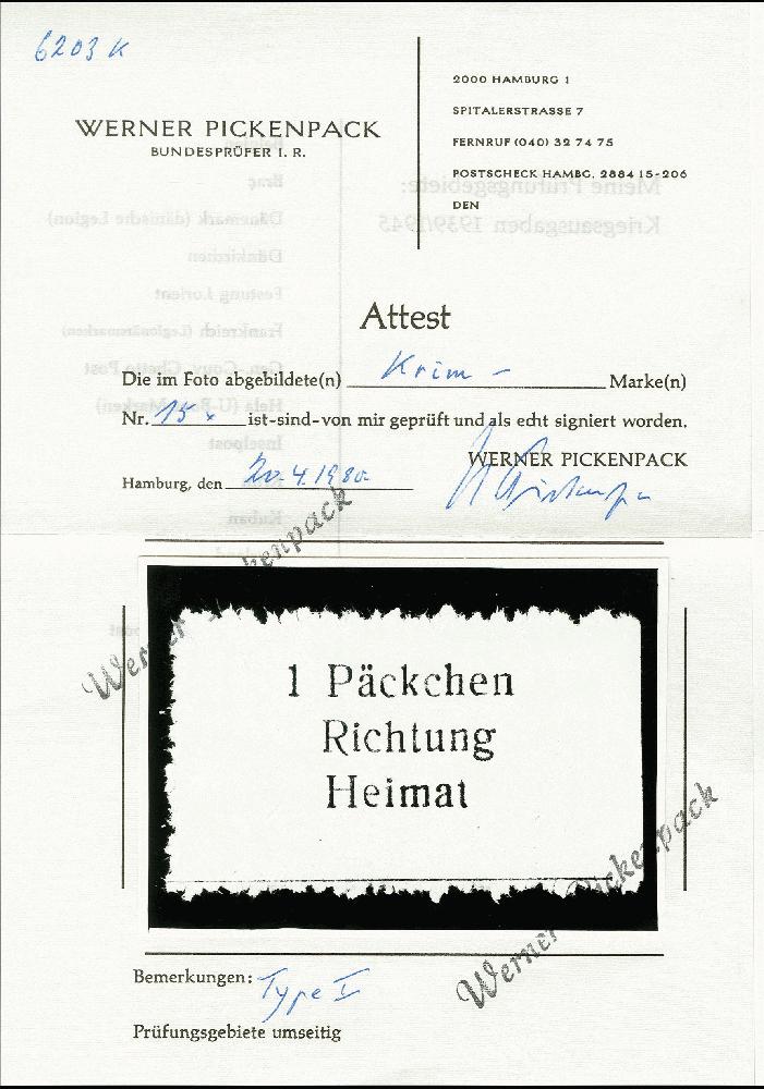 | Zusatzinformationen und Suchstichworte: | 366. Auktion Heinrich Köhler Auktionstermin 19.-24.03.2018 Los 2303 1943, Krim-Päckchenmarke, Type I vom rechten Seitenrand, ungebraucht ohne Gummi wie verausgabt, tadellos, sign. Pickenpack BPP mit Fotoattest (1980) und Fotoattest Zirath BPP (2017) Ausruf 350,00 EUR |