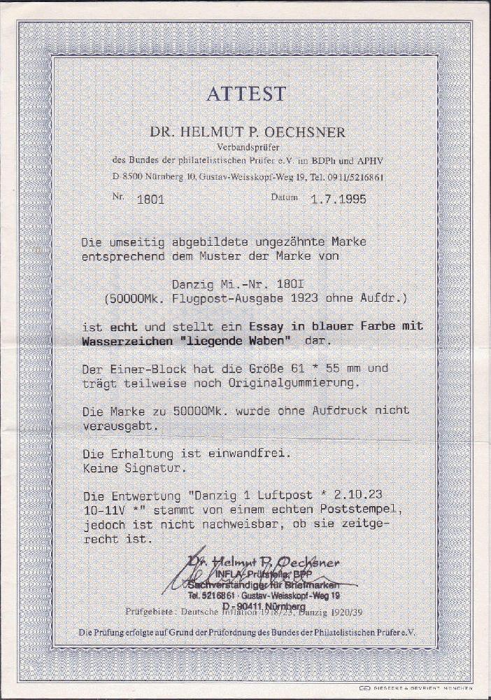 | Zusatzinformationen und Suchstichworte: | 200. Auktionshaus Schulz Auktion Auktionstermin: 18. - 19. Juli 2022 Los 3324 Danzig Flugpost, sehr seltener Probedruck 50.000 Mark blau ungezähnt im Block (61x55 mm) mit WZ "3Y", die Marke zu 50.000 Mark wurde ohne Aufdruck nicht verausgabt, entwertet "Danzig 1 Luftpost 2.10.23", Rarität 1.Ranges! Ausführliches FA Dr. Oechsner BPP "echt und einwandfrei" (Ehemaliger Ausruf: 1000.00 EUR) Zuschlag 440,00 EUR |