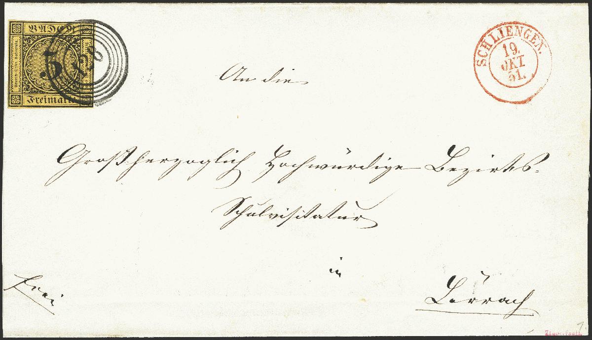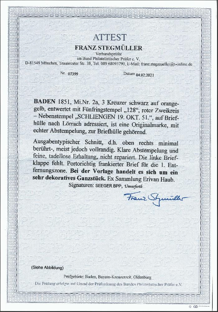 | Zusatzinformationen und Suchstichworte: | 376. Auktion Heinrich Köhler 19.-24. April 2021 Los 2 3 Kreuzer schwarz auf orangegelb, sehr schön farbfrisch, rechts oben leicht berührt, sonst allseits vollrandig, mit klar aufgesetzter Nummer "128" und sauber nebengesetztem roten Doppelkreisstempel "SCHLIENGEN 19 OKT. 51" auf Briefhülle (Seitenklappen fehlend) nach Lörrach. Ein attraktives Stück. Signiert Unverferth und Seeger BPP, Fotoattest Stegmüller BPP (2021) Ausruf 100,00 EUR Zuschlag 1.050,00 EUR (aus der Sammlung Erivan Haub) |