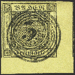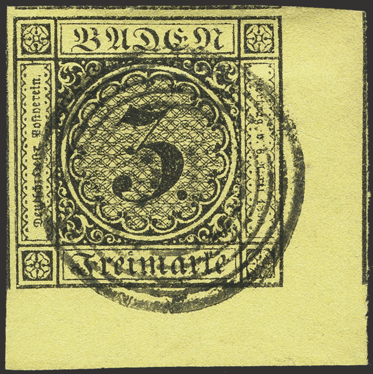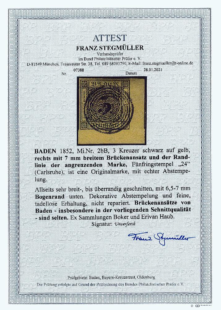 | Zusatzinformationen und Suchstichworte: | 376. Auktion Heinrich Köhler 19.-24. April 2021 Los 4 3 Kreuzer schwarz auf gelb, allseits breitrandiges Unterrandstück mit Teilen von 2 Nachbarmarken, unten 6,5/7 mm Bogenrand und rechts vollem Zwischensteg mit Randlinie der rechten Nachbarmarke, leicht entwertet durch zentrische Nummer "24" KARLSRUHE. Tadellose Erhaltung. Ein ganz außergewöhnliches Stück. Signiert Unverferth und Fotoattest Stegmüller BPP (2021) Ausruf 500,00 EUR Zuschlag 1.700,00 EUR (aus der Sammlung Erivan Haub) |