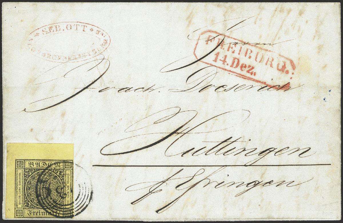 | Zusatzinformationen und Suchstichworte: | 376. Auktion Heinrich Köhler 19.-24. April 2021 Los 5 3 Kreuzer schwarz auf gelb, linke obere Bogenecke, farbfrisch und noch voll- bis breitrandig, links mit 3,5 mm und unten mit 6,5 mm Bogenrand, mit leicht und sauber aufgesetzter Nummer "43" auf komplettem Faltbrief mit sauber nebengesetztem Rahmenstempel "FREIBURG 14. Dez." (1852) nach Huttingen bei Efringen. Ein attraktiver Brief. Signiert Kruschel und Fotoattest Stegmüller BPP (2021) Ausruf 400,00 EUR Zuschlag 500,00 EUR (aus der Sammlung Erivan Haub) |