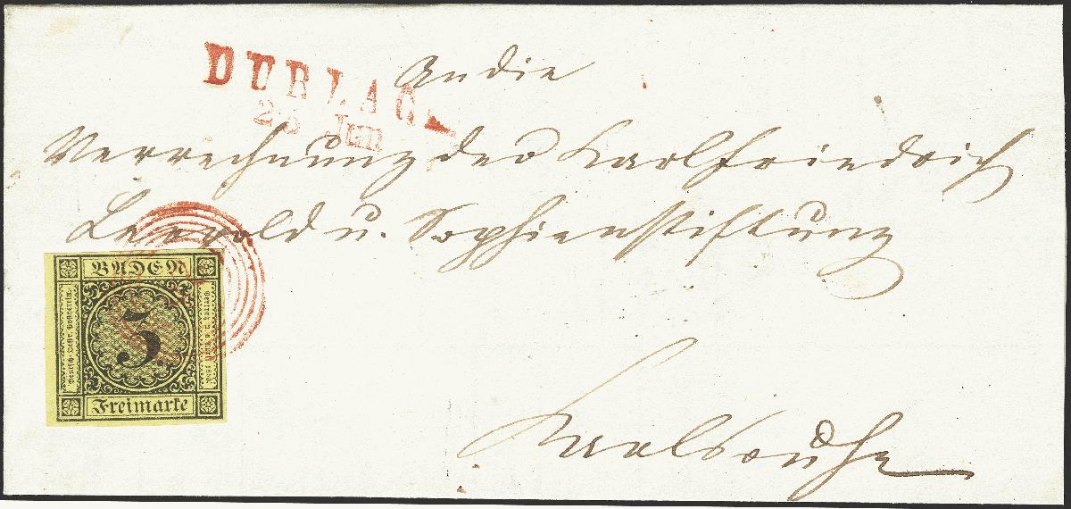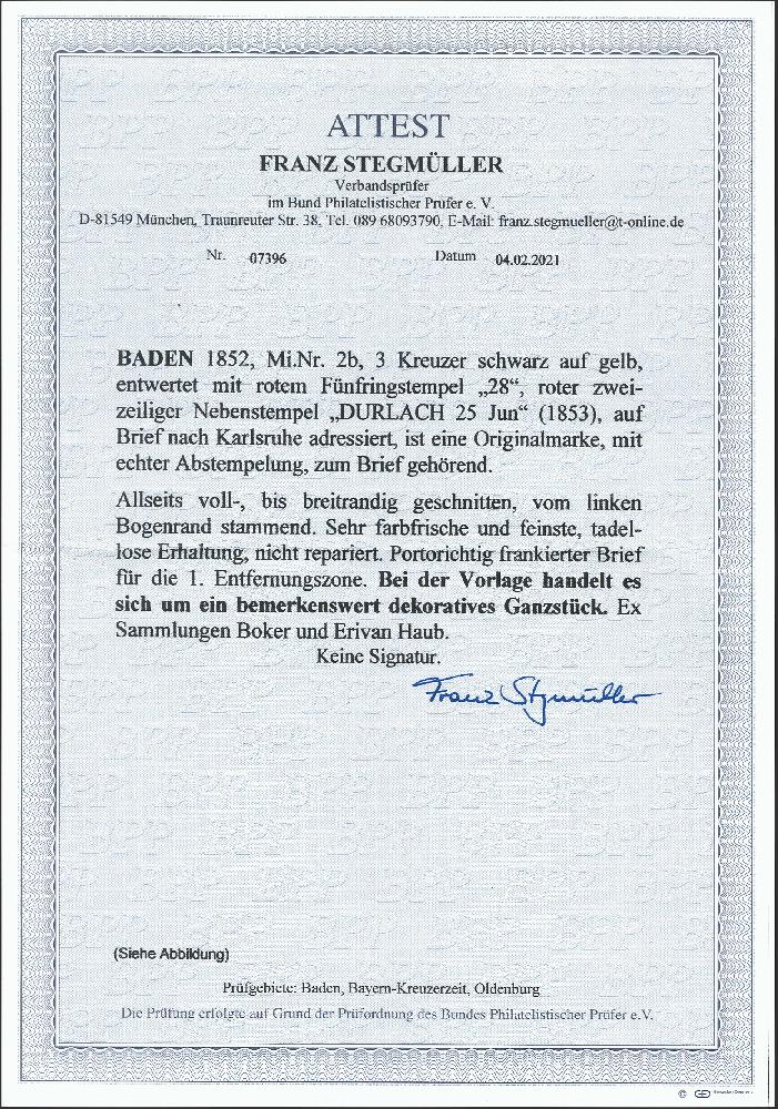 | Zusatzinformationen und Suchstichworte: | 376. Auktion Heinrich Köhler 19.-24. April 2021 Los 6 3 Kreuzer schwarz auf gelb, farbfrisch und allseits breitrandig, links mit schmalem Bogenrand, mit leicht und sauber aufgesetzter roter Nummer "28" und nebengesetztem roten "DURLACH 25 Jun." (1853) auf Faltbrief (ein Seitenteil fehlend) nach Karlsruhe. Ein attraktiver Brief in tadelloser Erhaltung. Fotoattest Stegmüller BPP (2021) Ausruf 150,00 EUR Zuschlag 750,00 EUR (aus der Sammlung Erivan Haub) |