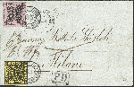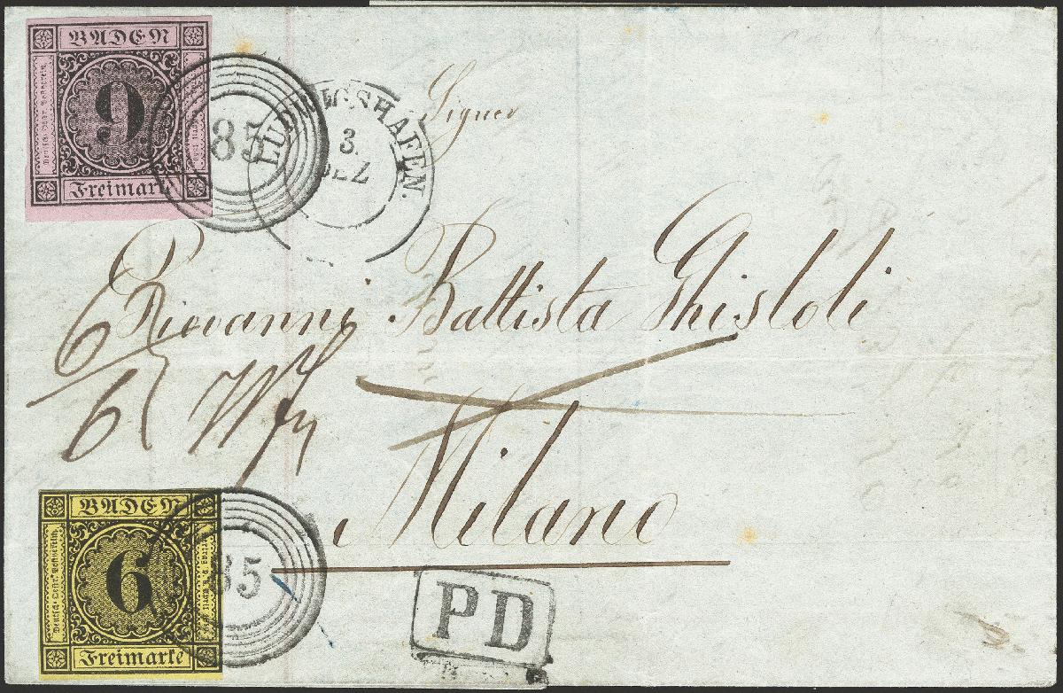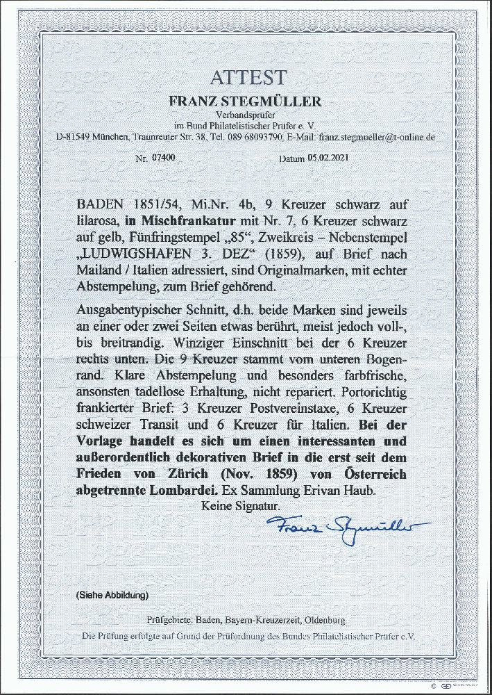 | Zusatzinformationen und Suchstichworte: | 376. Auktion Heinrich Köhler 19.-24. April 2021 Los 8 2. Auflage 9 Kreuzer schwarz auf lilarosa, rechts leicht berührt, sonst voll- bis breitrandig, unten mit 2 mm Bogenrand, in Mischfrankatur mit 1854, 6 Kreuzer schwarz auf rötlichgelb, mit jeweils klar aufgesetzter Nummer "85" und nebengesetztem Doppelkreisstempel "LUDWIGSHAFEN 3 DEZ." (1859) auf komplettem Faltbrief über die Schweiz nach Mailand mit Durchgangsstempeln von Konstanz und St. Gallen sowie Ankunftsstempel vom 6. Dezember. Der Brief ist portogerecht frankiert mit 3 Kreuzern Vereinsporto, 6 Kreuzern Schweizer Transit und 6 Kreuzern fremdem Porto. Nach dem serbischen Krieg trat Österreich im Frieden von Zürich am 10. November 1859 die Lombardei an den französischen Kaiser Napoléon III. ab, der die Lombardei dann an das Königreich Sardinien übergab. Ein postgeschichtlich sehr interessanter Brief mit attraktiver und seltener Mischfrankatur. Fotoattest Stegmüller BPP (2021) Ausruf 500,00 EUR Zuschlag 3.600,00 EUR (aus der Sammlung Erivan Haub) |