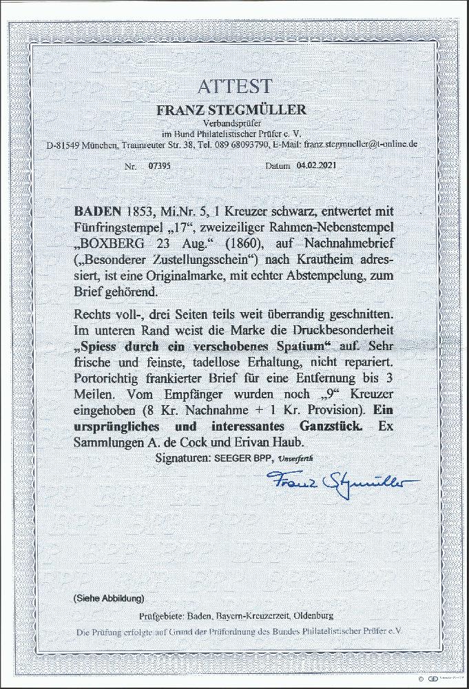 | Zusatzinformationen und Suchstichworte: | 376. Auktion Heinrich Köhler 19.-24. April 2021 Los 9 1853, 1 Kreuzer schwarz, rechts noch voll- sonst allseits überrandig mit Teilen von 4 Nachbarmarken, im unteren Rand mit markantem Druckspieß, leicht entwertet durch Nummer "17" auf komplettem Nachnahme-Faltbrief mit nebengesetztem Rahmenstempel "BOXBERG 23 Aug." (1860) nach Krautheim. Vom Empfänger wurden noch "9" Kreuzer eingezogen (8 Kreuzer Nachnahme plus 1 Kreuzer Provision), ein interessanter und attraktiver Brief. Signiert Unverferth und Seeger BPP Ausruf 100,00 EUR Zuschlag 300,00 EUR (aus der Sammlung Erivan Haub) |
