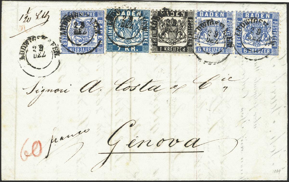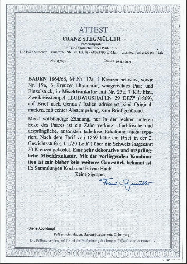 | Zusatzinformationen und Suchstichworte: | 376. Auktion Heinrich Köhler 19.-24. April 2021 Los 12 1862/66, 1 Kreuzer schwarz und 6 Kreuzer ultramarin, waagerechtes Paar und Einzelstück, in Mischfrankatur mit 1868, 7 Kreuzer blau, alle farbfrisch und bis auf einen verkürzten Zahn bei dem Paar einwandfrei gezähnt, mit einzeln sauber aufgesetztem Doppelkreisstempel "LUDWIGSHAFEN 29 DEZ" (1869) auf komplettem Faltbrief der 2. Gewichtsstufe nach Genua. Ein außerordentlich attraktiver Brief mit einmaliger Frankaturkombination, wenn auch für den Leitweg über die Schweiz nach dem neuen Tarif von 1869 um 6 Kreuzer überfrankiert. Fotoattest Stegmüller BPP (2021) Ausruf 2.000,00 EUR Zuschlag 8.500,00 EUR (aus der Sammlung Erivan Haub) |