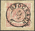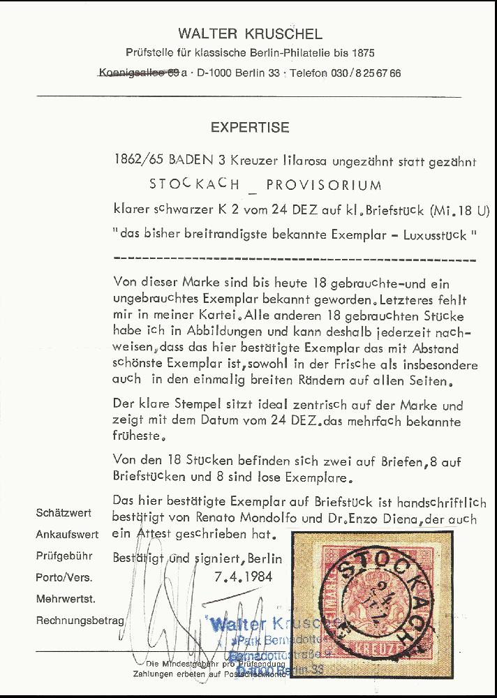 | Zusatzinformationen und Suchstichworte: | 376. Auktion Heinrich Köhler 19.-24. April 2021 Los 13 1862/66, 3 Kreuzer rosa ungezähnt, das sogenannte 'Stockach-Provisorium', sehr schön farbfrisch in der für diese Abart typischen Nuance und allseits enorm breitrandig, mit ideal aufgesetztem Doppelkreisstempel "STOCKACH 24. DEZ." auf Briefstück; feinste tadellose Erhaltung. Wir haben insgesamt 20 Exemplare des 'Stockach-Provisoriums' registriert, aufgrund deren man dieses Stück wohl als das 'Non plus ultra' dieser Marke bezeichnen kann. Signiert Renato Mondolfo, Enzo Diena und Kruschel, Fotoattest Stegmüller BPP (2019) Ausruf 20.000,00 EUR Zuschlag 135.000,00 EUR (aus der Sammlung Erivan Haub) |