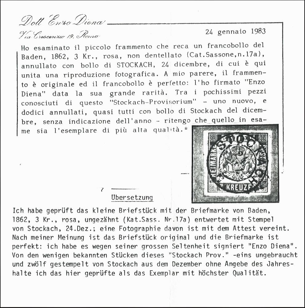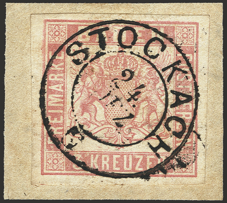 | Zusatzinformationen und Suchstichworte: | 376. Auktion Heinrich Köhler 19.-24. April 2021 Los 13 1862/66, 3 Kreuzer rosa ungezähnt, das sogenannte 'Stockach-Provisorium', sehr schön farbfrisch in der für diese Abart typischen Nuance und allseits enorm breitrandig, mit ideal aufgesetztem Doppelkreisstempel "STOCKACH 24. DEZ." auf Briefstück; feinste tadellose Erhaltung. Wir haben insgesamt 20 Exemplare des 'Stockach-Provisoriums' registriert, aufgrund deren man dieses Stück wohl als das 'Non plus ultra' dieser Marke bezeichnen kann. Signiert Renato Mondolfo, Enzo Diena und Kruschel, Fotoattest Stegmüller BPP (2019) Ausruf 20.000,00 EUR Zuschlag 135.000,00 EUR (aus der Sammlung Erivan Haub) |