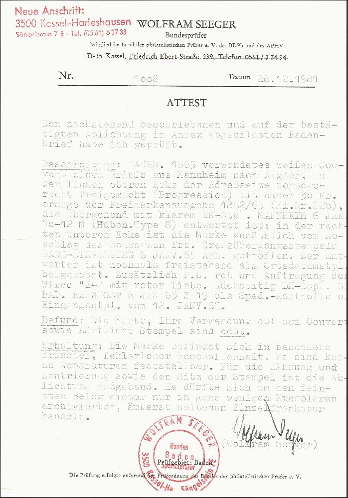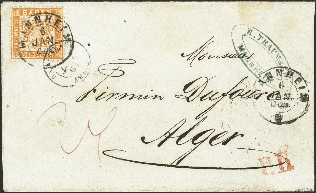 | Zusatzinformationen und Suchstichworte: | 376. Auktion Heinrich Köhler 19.-24. April 2021 Los 14 1862, Wappen 30 Kreuzer dunkelgelborange, farbfrisch und einwandfrei gezähnt mit sauber auf- und nebengesetztem Doppelkreisstempel "MANNHEIM 6 JAN." (1865) als portogerechte Einzelfrankatur auf Briefkuvert der 2. deutschen und 4. französischen Gewichtsstufe nach Algier mit auf die Marke leicht übergehendem französischen Transitstempel "BADE STRASBOURG" und rückseitigem Ankunftsstempel. Das Porto setzt sich zusammen aus 6 Kreuzern Vereinsporto und 24 Kreuzern Weiterfranko, dieses vorderseitig ausgewiesen. Insbesondere für diese Destination außerordentlich frische und tadellose Erhaltung. Einzelfrankaturen dieser Marke zählen zu den großen Seltenheiten Badens; wir haben 5 weitere registriert, davon wurden jedoch 2 zum letzten Mal in den 1920er Jahren angeboten. Der hier angebotene Brief ist ohne Zweifel der schönste der wenigen existierenden und durch die exotische Destination ein Spitzenstück der Baden-Philatelie. Signiert Kurt Maier, Heidelberg und Georg Bühler mit Fotoattest (1981), Fotoatteste Seeger BPP (1981) und Stegmüller BPP (2021) Ausruf 20.000,00 EUR Zuschlag 75.00,00 EUR (aus der Sammlung Erivan Haub) |