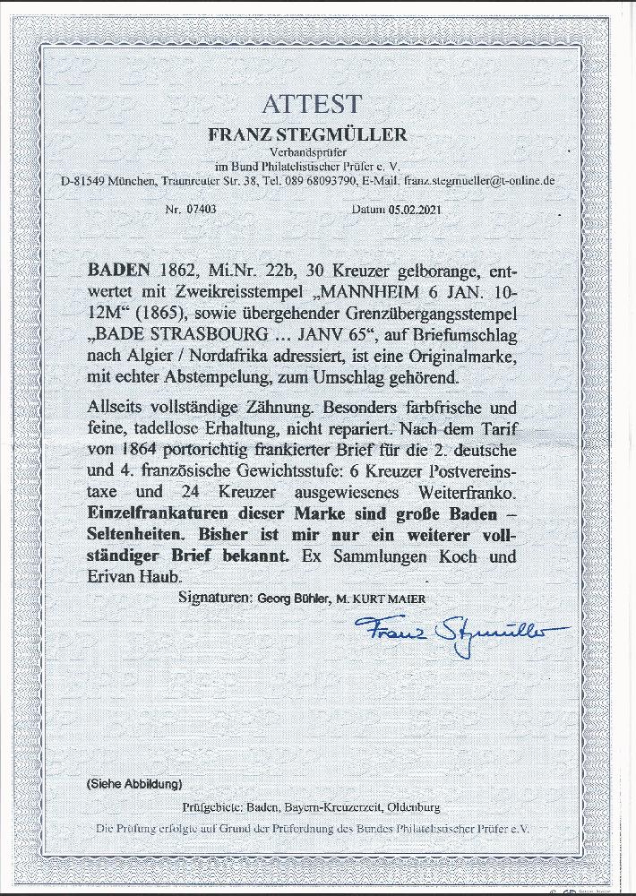 | Zusatzinformationen und Suchstichworte: | 376. Auktion Heinrich Köhler 19.-24. April 2021 Los 14 1862, Wappen 30 Kreuzer dunkelgelborange, farbfrisch und einwandfrei gezähnt mit sauber auf- und nebengesetztem Doppelkreisstempel "MANNHEIM 6 JAN." (1865) als portogerechte Einzelfrankatur auf Briefkuvert der 2. deutschen und 4. französischen Gewichtsstufe nach Algier mit auf die Marke leicht übergehendem französischen Transitstempel "BADE STRASBOURG" und rückseitigem Ankunftsstempel. Das Porto setzt sich zusammen aus 6 Kreuzern Vereinsporto und 24 Kreuzern Weiterfranko, dieses vorderseitig ausgewiesen. Insbesondere für diese Destination außerordentlich frische und tadellose Erhaltung. Einzelfrankaturen dieser Marke zählen zu den großen Seltenheiten Badens; wir haben 5 weitere registriert, davon wurden jedoch 2 zum letzten Mal in den 1920er Jahren angeboten. Der hier angebotene Brief ist ohne Zweifel der schönste der wenigen existierenden und durch die exotische Destination ein Spitzenstück der Baden-Philatelie. Signiert Kurt Maier, Heidelberg und Georg Bühler mit Fotoattest (1981), Fotoatteste Seeger BPP (1981) und Stegmüller BPP (2021) Ausruf 20.000,00 EUR Zuschlag 75.00,00 EUR (aus der Sammlung Erivan Haub) |