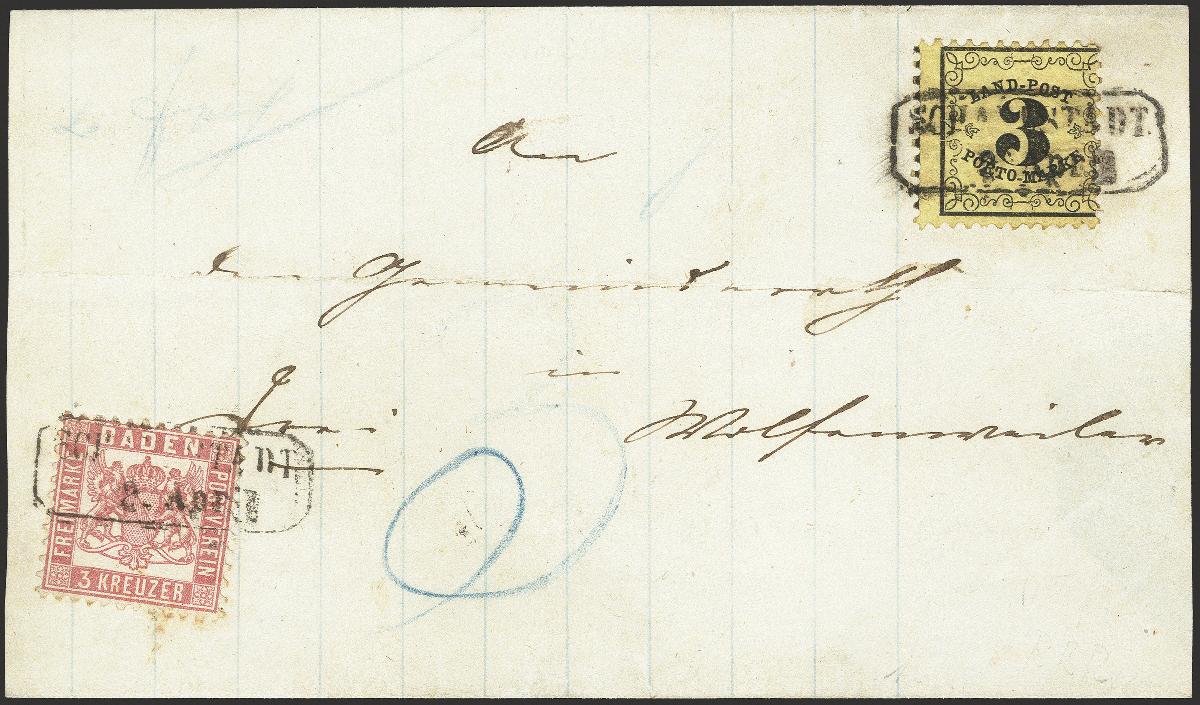 | Zusatzinformationen und Suchstichworte: | 376. Auktion Heinrich Köhler 19.-24. April 2021 Los 17 1862/63, 3 Kreuzer schwarz auf gelb, dünnes Papier in Kombination mit Freimarken 1862/66, 3 Kreuzer rosa, beide farbfrisch und gut gezähnt mit Rahmenstempel "SCHALLSTADT 2 Apr." auf Briefhülle (seitliche Briefklappen fehlend) nach Wolfenweiler. Die Sendung wurde mit 3 Kreuzern frankiert bei der Post aufgeliefert, da der Brief jedoch in die 2. Gewichtsstufe fiel ("2fach" oben links) mit 3 Kreuzern nachtaxiert und die Portomarke entsprechend frankiert. Die Landpost-Portomarke rechts oben kleiner Randspalt, sonst einwandfrei. Signiert Kruschel und Kanzleirat Metzger (handschriftlich), Fotoattest Stegmüller BPP (2021) Ausruf 1.000,00 EUR Zuschlag 1.450,00 EUR (aus der Sammlung Erivan Haub) |
