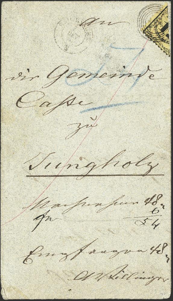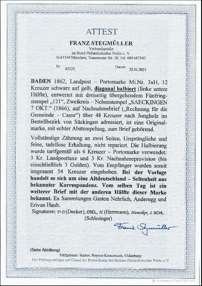 | Zusatzinformationen und Suchstichworte: | 376. Auktion Heinrich Köhler 19.-24. April 2021 Los 18 12 Kreuzer schwarz auf gelb, diagonal halbiert, linke untere Hälfte, farbfrisch und gut gezähnt, mit sauber übergehend aufgesetzter Nummer "121" auf komplettem Nachnahmebrief (Rechnung der Gemeindekasse) mit sauber nebengesetztem Doppelkreisstempel "SAECKINGEN 7 OKT." (1866) nach Jungholz im eigenen Bestellbezirk. Ein verwendungsbedingter Rotstrich leicht auf die Marke übergehend, tadellose und frische ursprüngliche Erhaltung. Mehrfach signiert, Fotoattest Stegmüller BPP (2021) Ausruf 7.000,00 EUR Zuschlag 21.000,00 EUR (aus der Sammlung Erivan Haub) |