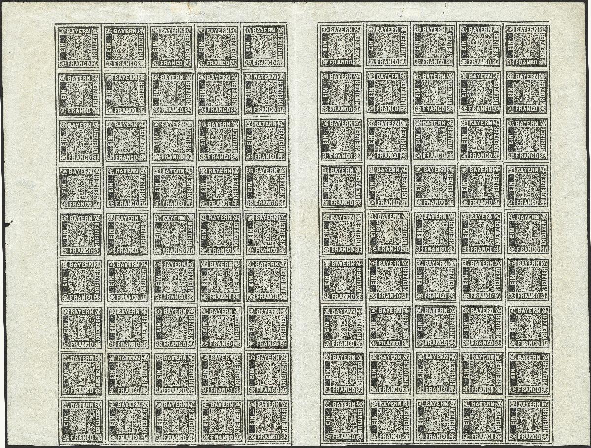 | Zusatzinformationen und Suchstichworte: | 376. Auktion Heinrich Köhler 19.-24. April 2021 Los 19 1849, 1 Kreuzer schwarz, Platte 1, unzerteilter Doppelbogen von 90 Werten in 2 Gruppen zu 45 Marken mit 9 waagerechten Zwischenstegpaaren, farbfrisch und bis auf wenige Randmängel (insbesondere einige Einrisse im Oberrand) in einwandfreier Erhaltung mit frischem, unberührtem Originalgummi, alle Werte postfrisch. Im Zwischensteg obligatorische Faltung. Dieser Doppelbogen stellt zweifellos eines der wichtigsten Stücke der deutschen Philatelie dar. Es ist nur ein weiterer Doppelbogen der Bayern Nr. 1 bekannt, dieser jedoch mit den beiden unteren Gruppen des Druckbogens (ex Sammlung Elster). Ein in dieser Form einmaliges Museumsstück. Fotoattest Schmitt BPP (1992). Ausruf 200.000,00 EUR Zuschlag 240.000,00 EUR (aus der Sammlung Erivan Haub) |