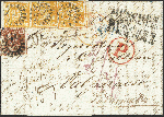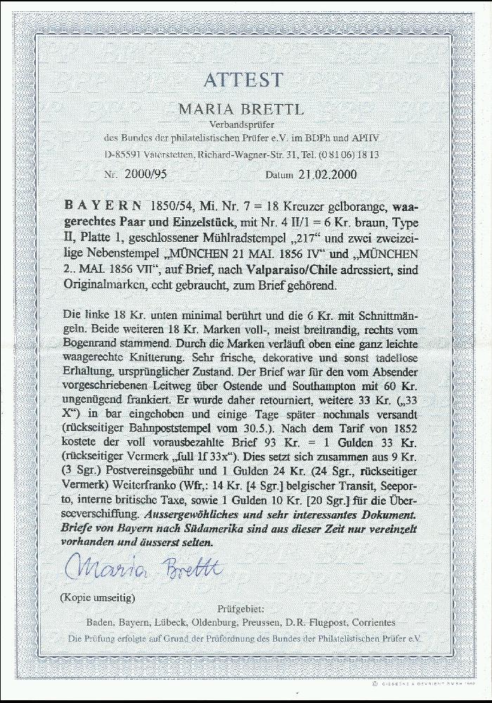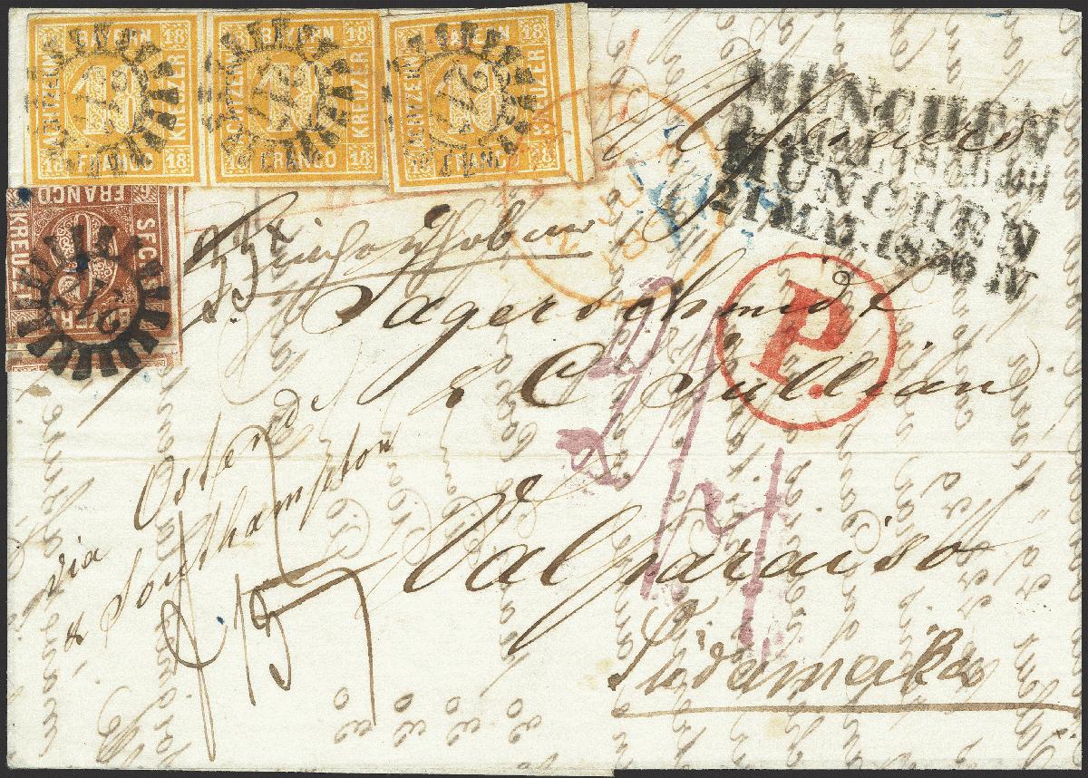 | Zusatzinformationen und Suchstichworte: | 376. Auktion Heinrich Köhler 19.-24. April 2021 Los 26 18 Kreuzer gelborange, waagerechtes Paar und Einzelmarke, die linke Marke des Paares links unten etwas berührt, sonst voll- bis breitrandig, die Einzelmarke mit schmalem rechten Bogenrand, zusammen mit verschnittener 6 Kreuzer braun, mit geschlossenem Mühlradstempel "217" und nebengesetztem Langstempel "MÜNCHEN 21 MAI 1856" auf Faltbrief mit Leitvermerk "via Ostende & Southampton" nach Valparaiso, Chile. Offenbar bei der Bahnpost wurde bemerkt, dass der Brief für diesen Leitweg um 33 Kreuzer unterfrankiert war und er wurde mit Vermerk "33 x einzuheben" retourniert. Der Betrag wurde in bar nachbezahlt und der Brief mit Aufgabestempel "MÜNCHEN 29 MAI 1856" erneut aufgegeben, mit rückseitigem Vermerk "full 1 f 33 x" und korrektem Weiterfranko "24" (Silbergroschen). Die 18 Kreuzer-Werte zeigen im oberen Viertel eine leichte waagerechte Knitterspur, sonst einwandfreie und für eine solche Destination sehr frische Erhaltung. Ein außerordentlich seltener früher Transatlantik-Brief. Fotoattest Brettl BPP (2000) Ausruf 5.000,00 EUR Zuschlag 11.500,00 EUR (aus der Sammlung Erivan Haub) |