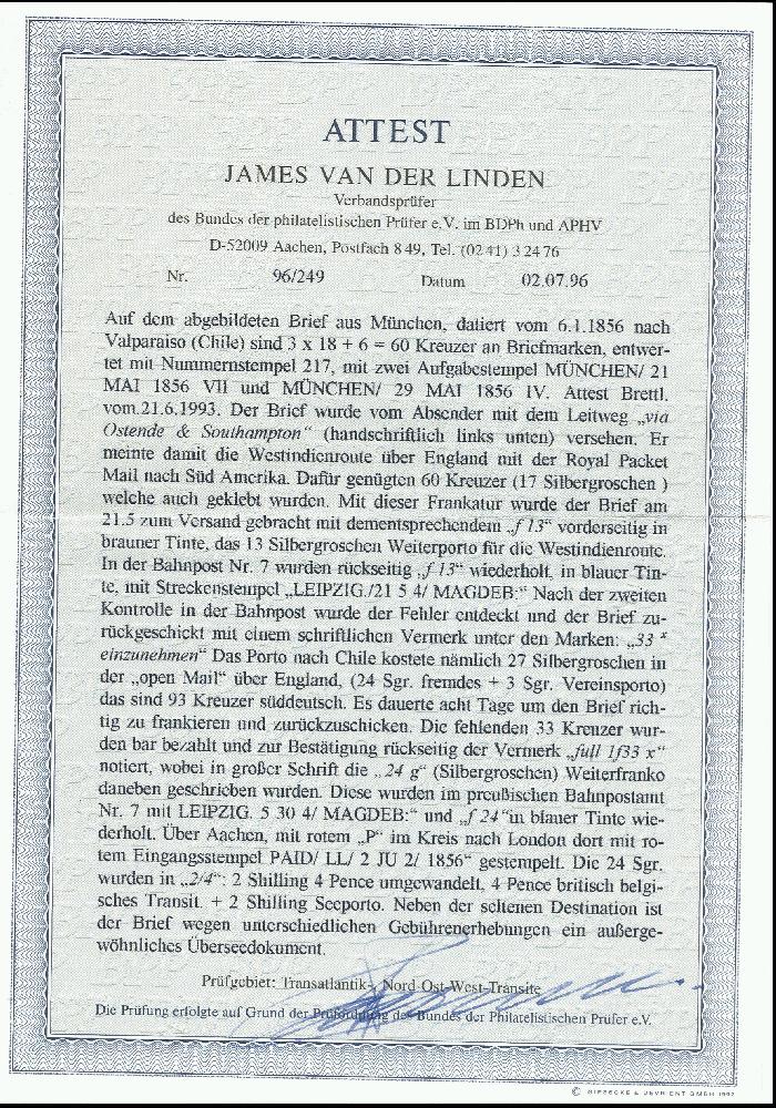 | Zusatzinformationen und Suchstichworte: | 376. Auktion Heinrich Köhler 19.-24. April 2021 Los 26 18 Kreuzer gelborange, waagerechtes Paar und Einzelmarke, die linke Marke des Paares links unten etwas berührt, sonst voll- bis breitrandig, die Einzelmarke mit schmalem rechten Bogenrand, zusammen mit verschnittener 6 Kreuzer braun, mit geschlossenem Mühlradstempel "217" und nebengesetztem Langstempel "MÜNCHEN 21 MAI 1856" auf Faltbrief mit Leitvermerk "via Ostende & Southampton" nach Valparaiso, Chile. Offenbar bei der Bahnpost wurde bemerkt, dass der Brief für diesen Leitweg um 33 Kreuzer unterfrankiert war und er wurde mit Vermerk "33 x einzuheben" retourniert. Der Betrag wurde in bar nachbezahlt und der Brief mit Aufgabestempel "MÜNCHEN 29 MAI 1856" erneut aufgegeben, mit rückseitigem Vermerk "full 1 f 33 x" und korrektem Weiterfranko "24" (Silbergroschen). Die 18 Kreuzer-Werte zeigen im oberen Viertel eine leichte waagerechte Knitterspur, sonst einwandfreie und für eine solche Destination sehr frische Erhaltung. Ein außerordentlich seltener früher Transatlantik-Brief. Fotoattest Brettl BPP (2000) Ausruf 5.000,00 EUR Zuschlag 11.500,00 EUR (aus der Sammlung Erivan Haub) |