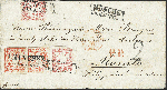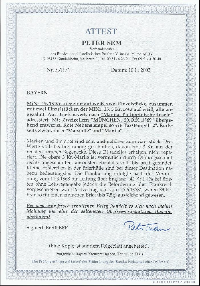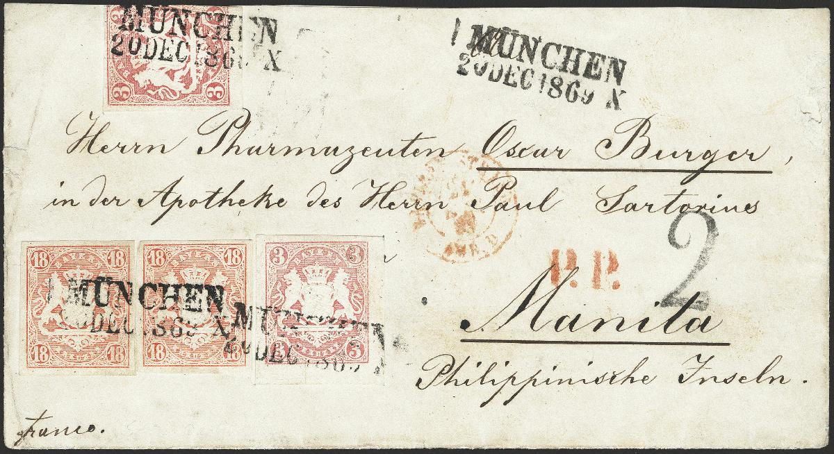 | Zusatzinformationen und Suchstichworte: | 376. Auktion Heinrich Köhler 19.-24. April 2021 Los 32 1867, 18 Kreuzer ziegelrot, 2 Einzelwerte zusammen mit 2 Einzelstücken 3 Kreuzer rosa, davon eine (wahrscheinlich bei Brieföffnung) rechts beschnitten, sonst alle voll- bis breitrandig, die andere 3 Kreuzer-Marke aus der rechten unteren Bogenecke stammend, mit mehrfach sauber aufgesetztem Langstempel "MÜNCHEN 20 DEC. 1869" auf Briefkuvert über Frankreich nach Manila auf den Philippinen mit Transit- und Ankunftsstempeln. Der Brief war für eine Beförderung über England mit 42 Kreuzern frankiert, da jedoch keine Leitwegangabe erfolgte, war die Beförderung über Frankreich vorgeschrieben, für die eine Frankatur mit 39 Kreuzern für einen einfachen Brief bis 7,5 g ausreichend gewesen wäre. Im Kuvert rechts kleine Fehlstelle und links kleiner Randmangel, sonst ungewöhnlich frische und einwandfreie Erhaltung. Die Philippinen zählen zu den seltensten Destinationen für Briefe aus den altdeutschen Staaten. Fotoattest Sem BPP (2003) Ausruf 5.000,00 EUR Zuschlag 19.000,00 EUR (aus der Sammlung Erivan Haub) |