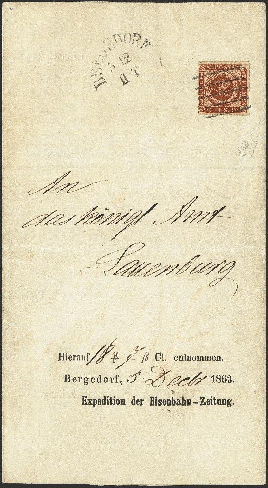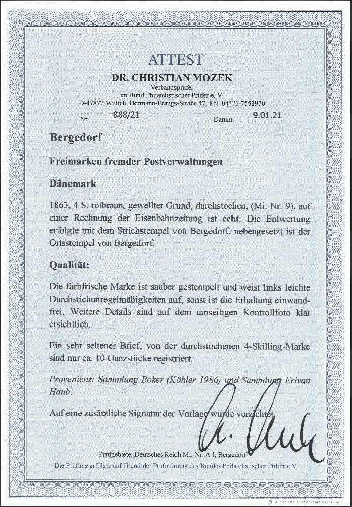 | Zusatzinformationen und Suchstichworte: | 376. Auktion Heinrich Köhler 19.-24. April 2021 Los 39 DÄNEMARK: 1863, 4 Skilling rotbraun, durchstochen, mit sauber aufgesetztem Strichstempel und nebengesetztem "BERGEDORF 5 12" (1863) auf Rechnung der Eisenbahnzeitung nach Lauenburg mit Ankunftsstempel. Im Formular oben kleiner Einriß hinterklebt, sonst bis auf leichte Durchstichunregelmäßigkeiten einwandfrei. Ein attraktives Stück. Fotoattest Dr. Mozek BPP (2021) Ausruf 1.000,00 EUR Zuschlag 2.100,00 EUR (aus der Sammlung Erivan Haub) |