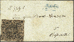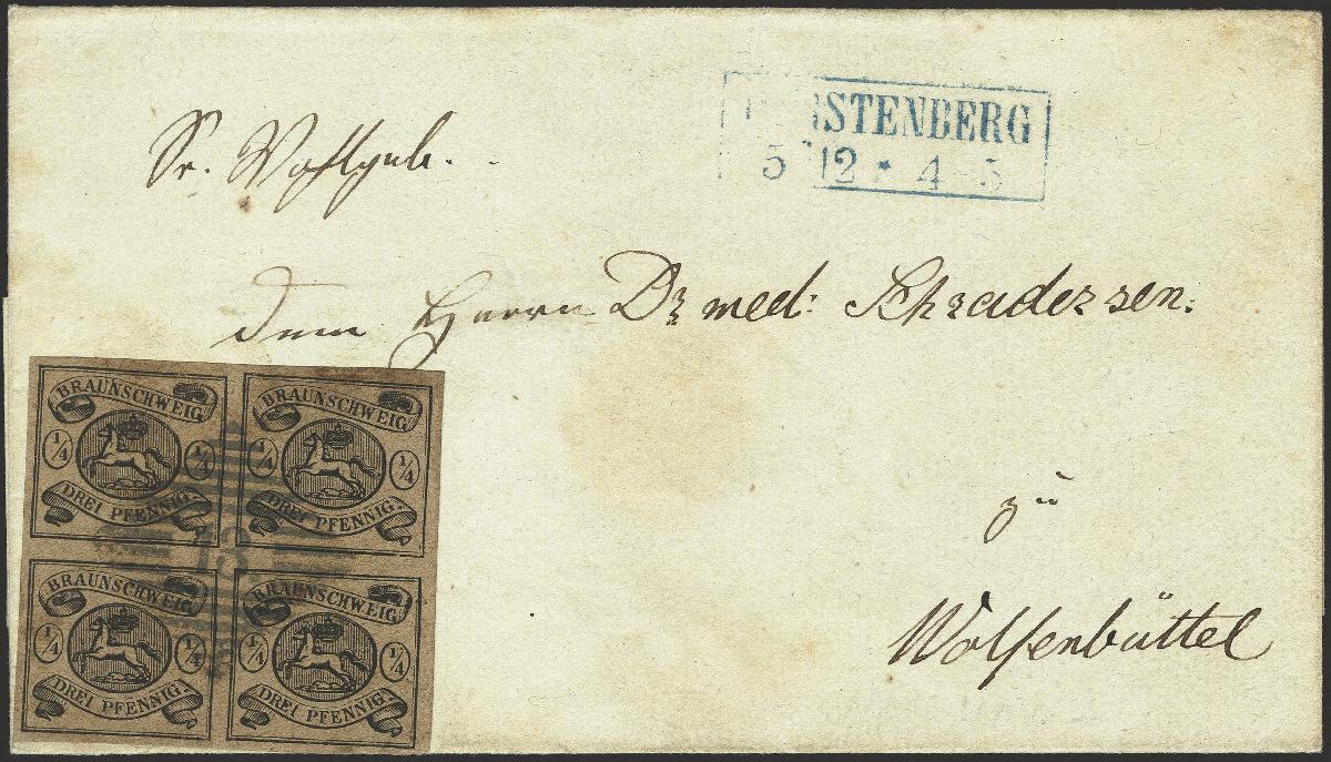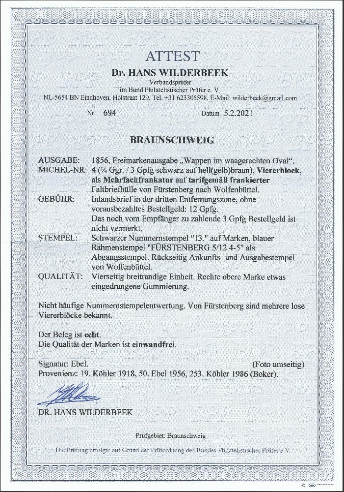 | Zusatzinformationen und Suchstichworte: | 376. Auktion Heinrich Köhler 19.-24. April 2021 Los 47 ¼ Gutegroschen schwarz auf gelbbraun im 4er-Block, farbfrisch und allseits breitrandig mit zentrisch klarer Nummer "13" auf Briefhülle mit nebengesetztem blauen Rahmenstempel "FÜRSTENBERG 5/12" nach Wolfenbüttel mit Ankunfts- und Ausgabestempel. Bei der rechten oberen Marke Gummi leicht durchschlagend, sonst einwandfrei. Eine attraktive und seltene Block-Frankatur. Signiert Ebel und Fotoattest Dr. Wilderbeek BPP (2021) Ausruf 1.000,00 EUR Zuschlag 2.600,00 EUR (aus der Sammlung Erivan Haub) |