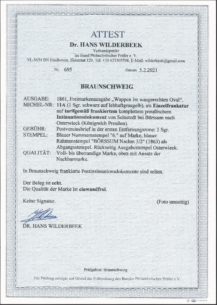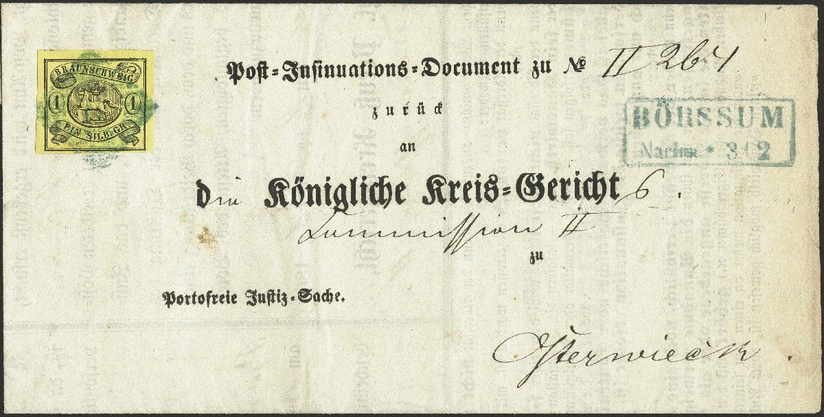 | Zusatzinformationen und Suchstichworte: | 376. Auktion Heinrich Köhler 19.-24. April 2021 Los 49 1 Silbergroschen schwarz auf gelb in leuchtend frischer Farbe und voll- bis überrandig mit blauer Nummer "6" und nebengesetztem blauen Rahmenstempel "BÖRSSUM Nachm. 3/2" (1863) auf Post-Insinuations-Dokument zurück an das königliche Kreisgericht in Osterwieck mit Ausgabestempel. Schöne und einwandfreie Erhaltung. Ein seltenes frankiertes Formular. Fotoattest Dr. Wilderbeek BPP (2021) Ausruf 500,00 EUR Zuschlag 3.400,00 EUR (aus der Sammlung Erivan Haub) |