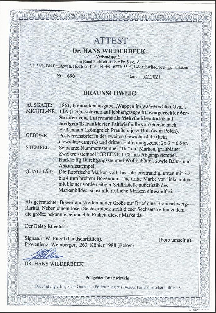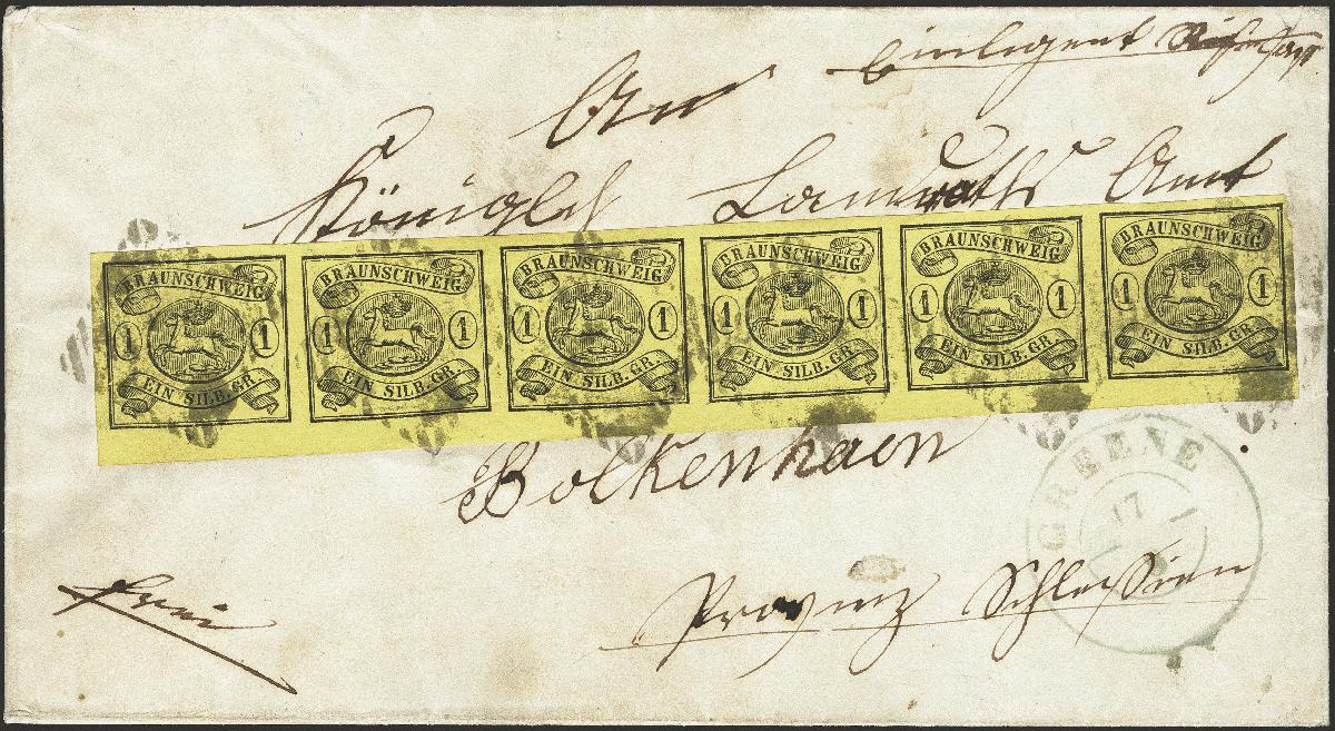 | Zusatzinformationen und Suchstichworte: | 376. Auktion Heinrich Köhler 19.-24. April 2021 Los 50 1 Silbergroschen schwarz auf gelb im waagerechten 6er-Streifen, schöne leuchtend frischer Farbe, rechts oben voll-, sonst allseits breit- bis überrandig, unten mit 3/4 mm Bogenrand, mit einzeln aufgesetzter Nummer "16" und nebengesetztem Doppelkreisstempel "GREENE 17/8" auf Briefhülle der 2. Gewichtsstufe nach Bolkenhain in Schlesien mit Durchgangsstempel von Wolfenbüttel, Bahnpost- und Ausgabestempeln. Die dritte Marke von links winzige Schürfung in der unteren Randlinie, sonst tadellose und sehr frische Erhaltung. Ein phantastischer und altbekannter Brief aus der Konsul Weinberger-Sammlung mit der größten bekannten Einheit dieser Marke (es ist nur noch ein loser 6er-Block bekannt). Signiert W. Engel (handschriftlich) mit Fotoattest (1980), Fotoattest Dr. Wilderbeek BPP (202 Ausruf 20.000,00 EUR Zuschlag 54.000,00 EUR (aus der Sammlung Erivan Haub) |