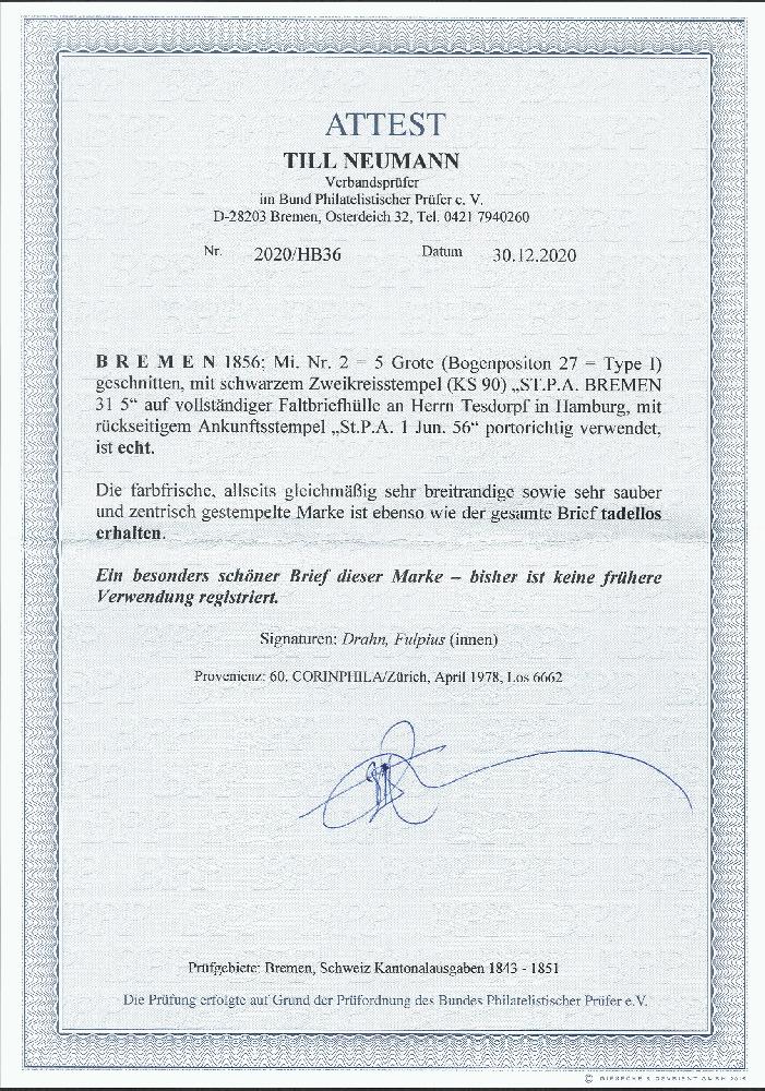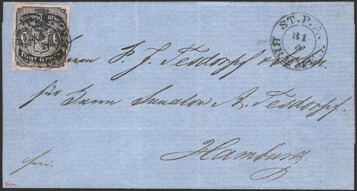 | Zusatzinformationen und Suchstichworte: | 376. Auktion Heinrich Köhler 19.-24. April 2021 Los 55 1856, 5 Grote schwarz auf hellkarmingrau, Type I von Feld 27, sehr schön farbfrisch und allseits gleichmäßig breitrandig geschnitten mit sauber auf- und nebengesetztem Doppelkreisstempel "ST.P.A. BREMEN 31 5" (1856) auf Briefhülle an 'Herrn Senator A. Tesdorpf' in Hamburg mit Ankunftsstempel vom nächsten Tag. Dieser Brief dokumentiert die früheste bisher registrierte Verwendung dieser Marke. Ein außerordentlich attraktiver und seltener Brief in tadelloser Erhaltung. Signiert Drahn und Fulpius, Fotoatteste Engel BPP (1977) und Neumann BPP (2020) Ausruf 1.500,00 EUR Zuschlag 9.000,00 EUR (aus der Sammlung Erivan Haub) |