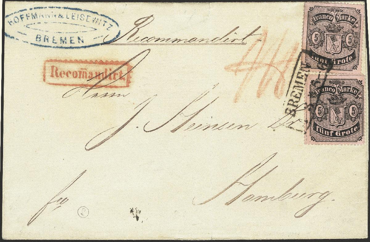 | Zusatzinformationen und Suchstichworte: | 376. Auktion Heinrich Köhler 19.-24. April 2021 Los 56 1862, 5 Grote schwarz auf hellkarmingrau mit regelmäßigem wellenförmigen Durchstich, 2 Einzelwerte der Bogenfelder 53 und 54, beide sehr schön farbfrisch mit sauber übergehendem Rahmenstempel "BREMEN 1 3" (1864) auf rekommandierter Briefhülle nach Hamburg mit Ankunftsstempel vom nächsten Tag. Die oben klebende Marke kleine, unauffällige Randfehler, sonst tadellose und ursprüngliche Erhaltung. Chargé-Briefe von Bremen sind außerordentlich selten, in den Postverein haben wir nur einen weiteren registriert (ebenfalls nach Hamburg). Fotoattest Neumann BPP (2020) Ausruf 3.000,00 EUR Zuschlag 7.000,00 EUR (aus der Sammlung Erivan Haub) |