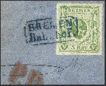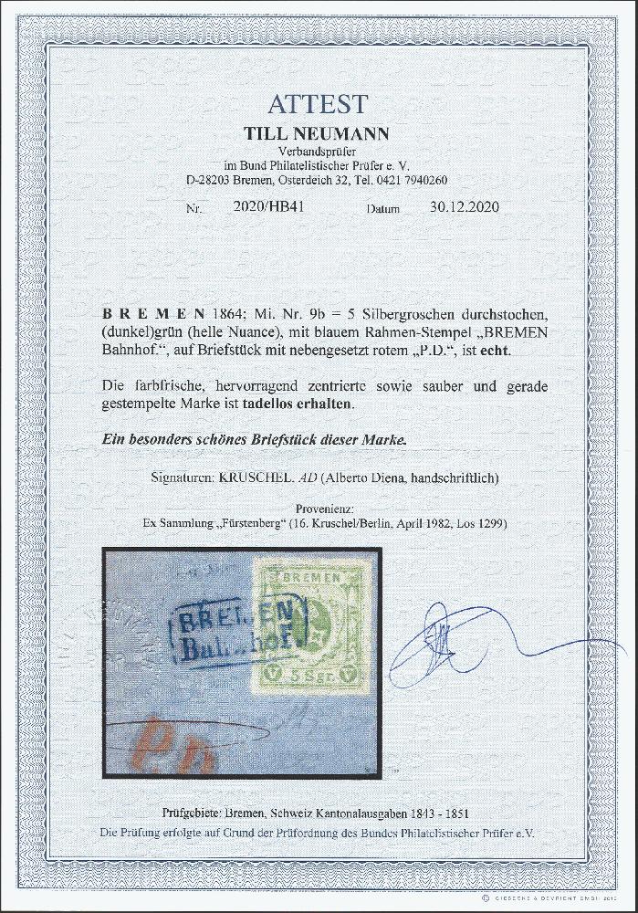 | Zusatzinformationen und Suchstichworte: | 376. Auktion Heinrich Köhler 19.-24. April 2021 Los 57 1864, 5 Silbergroschen grün, sauber durchstochen, sehr schön farbfrisch und hervorragend zentriert mit sauber aufgesetztem kleinen Rahmenstempel "BREMEN Bahnhof" auf Briefstück, Kabinett. Signiert Kruschel und Alberto Diena, Fotoattest Neumann BPP (2020) Provenienz: Sammlung Tomasini (16. Kruschel-Auktion, 1982) Ausruf 100,00 EUR Zuschlag 650,00 EUR (aus der Sammlung Erivan Haub) |