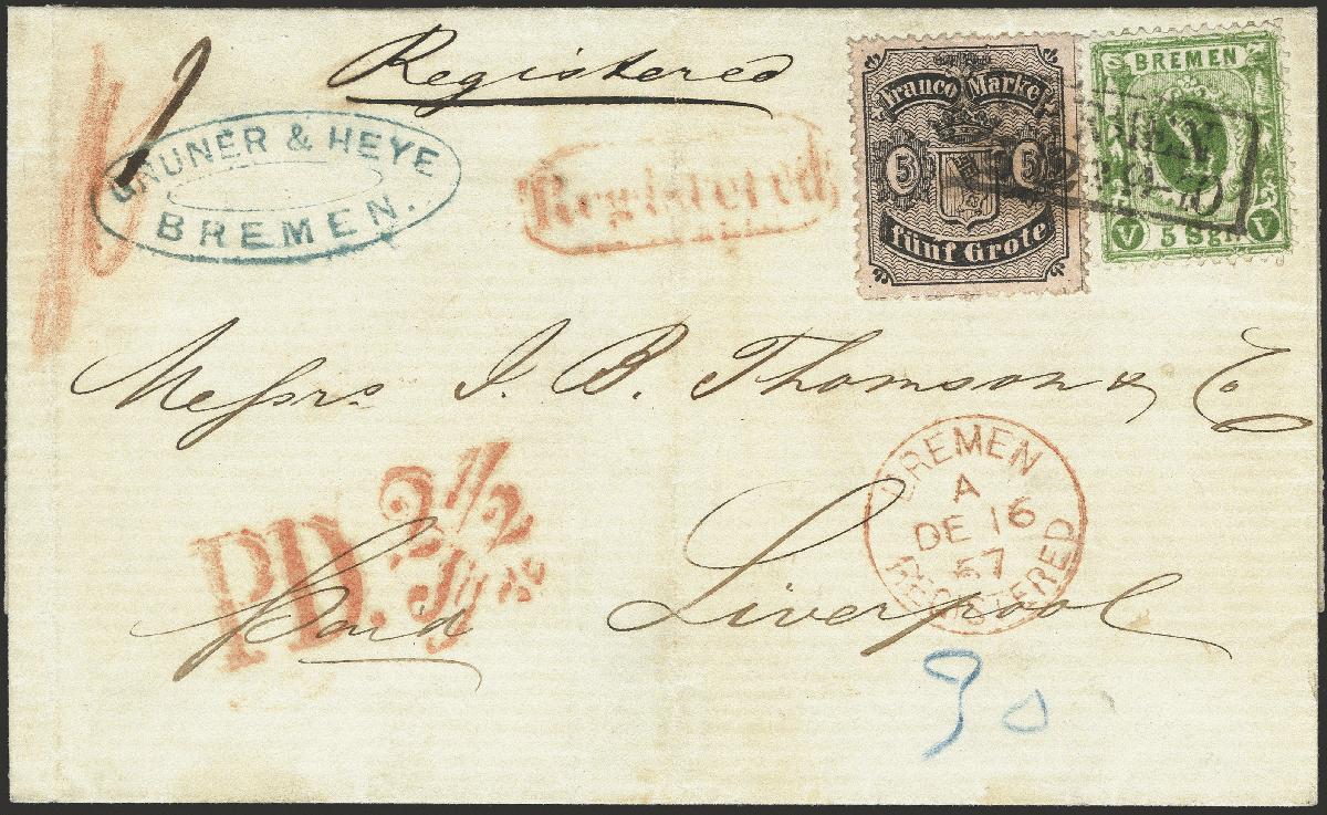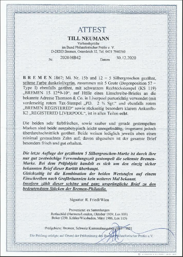 | Zusatzinformationen und Suchstichworte: | 376. Auktion Heinrich Köhler 19.-24. April 2021 Los 59 1867, Gezähnte Ausgabe 5 Silbergroschen dunkelolivgrün zusammen mit 5 Grote schwarz auf mattkarmingrau (Bogenfeld 57=Type I), beide sehr schön farbfrisch und für diese Ausgabe überdurchschnittlich gezähnt mit Rahmenstempel "BREMEN 15 12" auf eingeschriebener Briefhülle nach Liverpool mit vorderseitigem roten "BREMEN REGISTERED DE 16 67" und rückseitigem "REGISTERED LIVERPOOL" vom nächsten Tag. Sehr schöne frische und einwandfreie Erhaltung. Dieser Brief zählt zu den großen Seltenheiten der Bremen-Philatelie. Es handelt sich hier um den einzigen bekannten Brief mit einer dunkelolivgrünen 5 Silbergroschen, um einen von nur 2 bekannten Einschreibe-Briefen Bremens in das Ausland und darüber hinaus um eine einmalige Frankaturkombination auf Brief. Signiert Friedl, Wien sowie Fotoattest Neumann BPP (2020) Ausruf 30.000,00 EUR Zuschlag 105.000,00 EUR (aus der Sammlung Erivan Haub) |