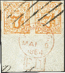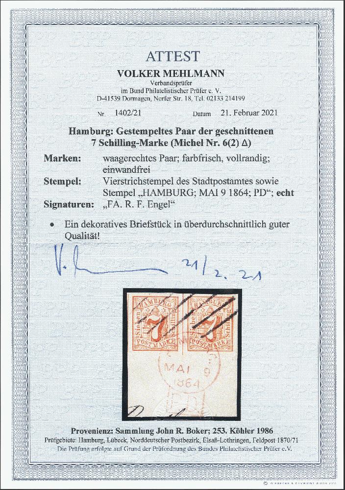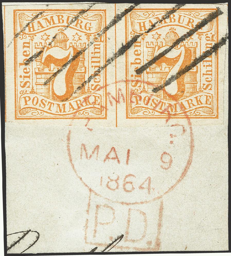 | Zusatzinformationen und Suchstichworte: | 376. Auktion Heinrich Köhler 19.-24. April 2021 Los 62 7 Schilling orange im waagerechten Paar, sehr schön farbfrisch und allseits breitrandig mit sauber aufgesetzten Strichstempeln und übergehendem roten "HAMBURG P.D. MAI 9 1864" auf Briefstück, Kabinett, Fotoattest Mehlmann BPP (2021) Ausruf 300,00 EUR Zuschlag 650,00 EUR (aus der Sammlung Erivan Haub) |
