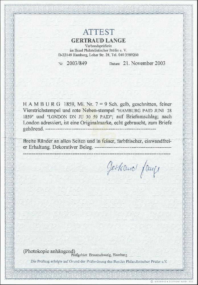 | Zusatzinformationen und Suchstichworte: | 376. Auktion Heinrich Köhler 19.-24. April 2021 Los 63 9 Schilling orangegelb in schöner tiefer Nuance, gut voll- bis breitrandig mit leicht und klar aufgesetztem Strichstempel auf Briefkuvert mit nebengesetztem roten "HAMBURG PAID JUNI 28 1859" nach London mit vorderseitigem roten Eingangsstempel vom 30.6. Ein kleiner Fleck im Briefkuvert rechts neben der Marke gereinigt, sonst besonders schöne frische und einwandfreie Erhaltung. Signiert Decker und Fotoattest Lange BPP (2003) Ausruf 6.000,00 EUR Zuschlag 14.500,00 EUR (aus der Sammlung Erivan Haub) |