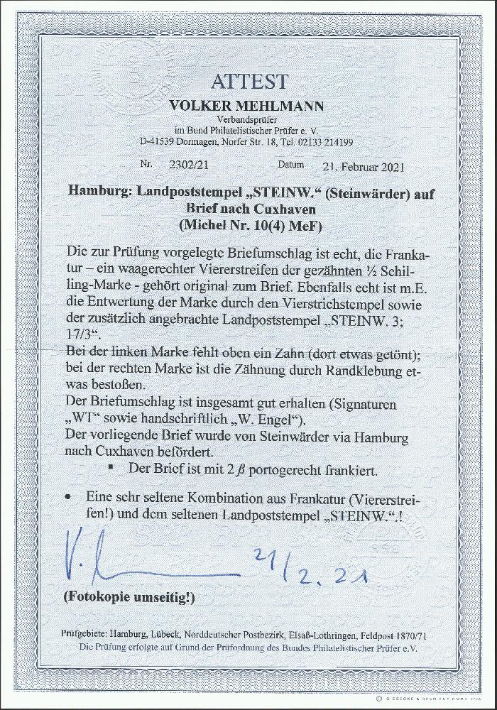 | Zusatzinformationen und Suchstichworte: | 376. Auktion Heinrich Köhler 19.-24. April 2021 Los 64 1864, ½ Schilling schwarz im waagerechten 4er-Streifen mit sauber aufgesetzten Strichstempeln und nebengesetztem Doppelkreisstempel "STEINW. 3/17 3" auf Briefkuvert mit vorderseitigem Ovalstempel "HAMBURG 17/3 66" nach Cuxhafen mit rückseitigem Ankunftsstempel von Ritzebüttel. Einige Buchstaben im Steinwärder-Stempel mit Bleistift etwas nachgemalt, der Streifen kleine Zahnmängel, insbesondere durch Randklebung oben rechts; insgesamt ein attraktiver und sehr seltener Brief. Signiert Walter Traber, Stock und W. Engel, Fotoattest Mehlmann BPP (2021) Ausruf 500,00 EUR Zuschlag 1.350,00 EUR (aus der Sammlung Erivan Haub) |