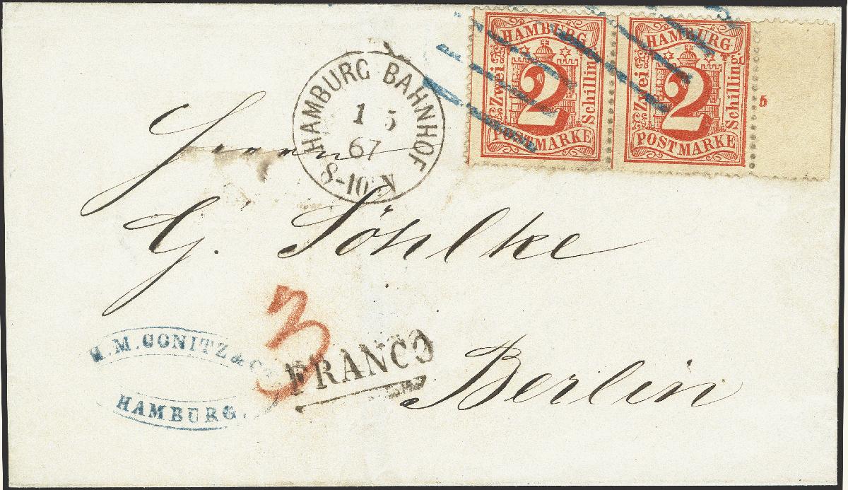 | Zusatzinformationen und Suchstichworte: | 376. Auktion Heinrich Köhler 19.-24. April 2021 Los 67 2 Schilling orangerot im waagerechten Randpaar mit breitem rechten Bogenrand, darauf Reihenzähler "5", sehr schön farbfrisch und bis auf einige verkürzte Zähne unten gut gezähnt, mit sauber aufgesetztem blauen Strichstempel und nebengesetztem Einkreisstempel "HAMBURG BAHNHOF 1 5 67" auf kleiner Briefhülle nach Berlin. Randstücke der gezähnten Ausgaben sind auf Brief außerordentlich selten. Ein sehr attraktives Stück in insgesamt guter Erhaltung. Fotoattest Mehlmann BPP (2021) Ausruf 500,00 EUR Zuschlag 1.800,00 EUR (aus der Sammlung Erivan Haub) |