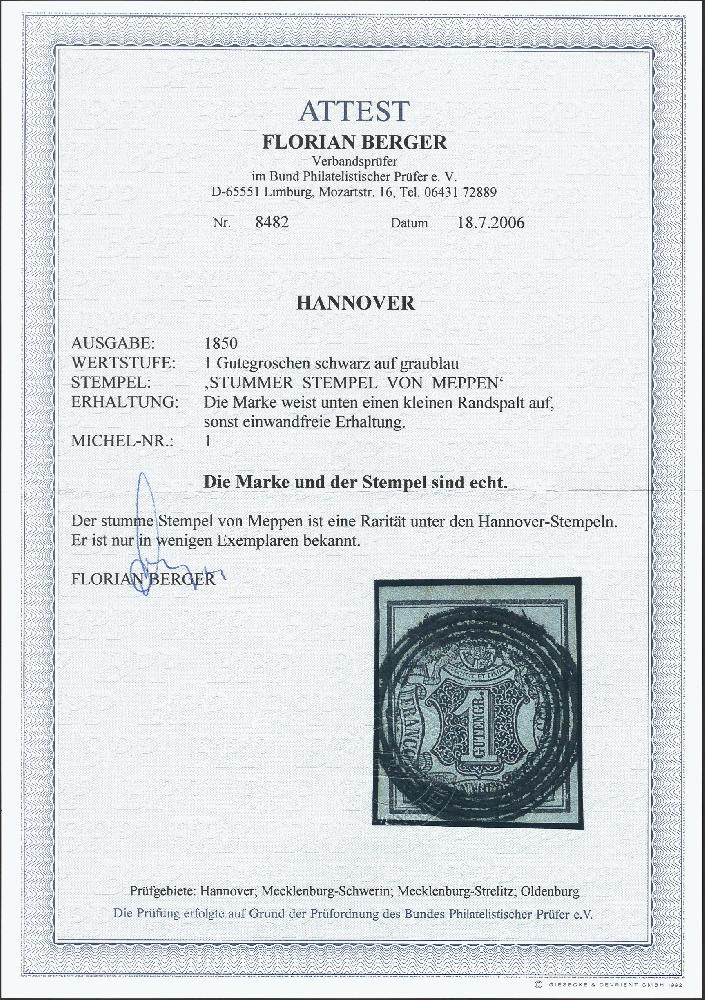 | Zusatzinformationen und Suchstichworte: | 376. Auktion Heinrich Köhler 19.-24. April 2021 Los 75 1850, 1 Gutegroschen schwarz auf graublau, farbfrisch und allseits breitrandig, sehr schön entwertet durch zentrisch und sauber aufgesetzten stummen Ringstempel von Meppen. Die Marke unten unauffälliger kleiner Randspalt, sonst einwandfrei. Eine der großen Stempelseltenheiten Hannovers, wir haben nur 2 weitere Marken mit dieser Entwertung registriert. Signiert Ressel und Fotoattest Berger BPP (2006) Ausruf 1.500,00 EUR Zuschlag 4.600,00 EUR (aus der Sammlung Erivan Haub) |