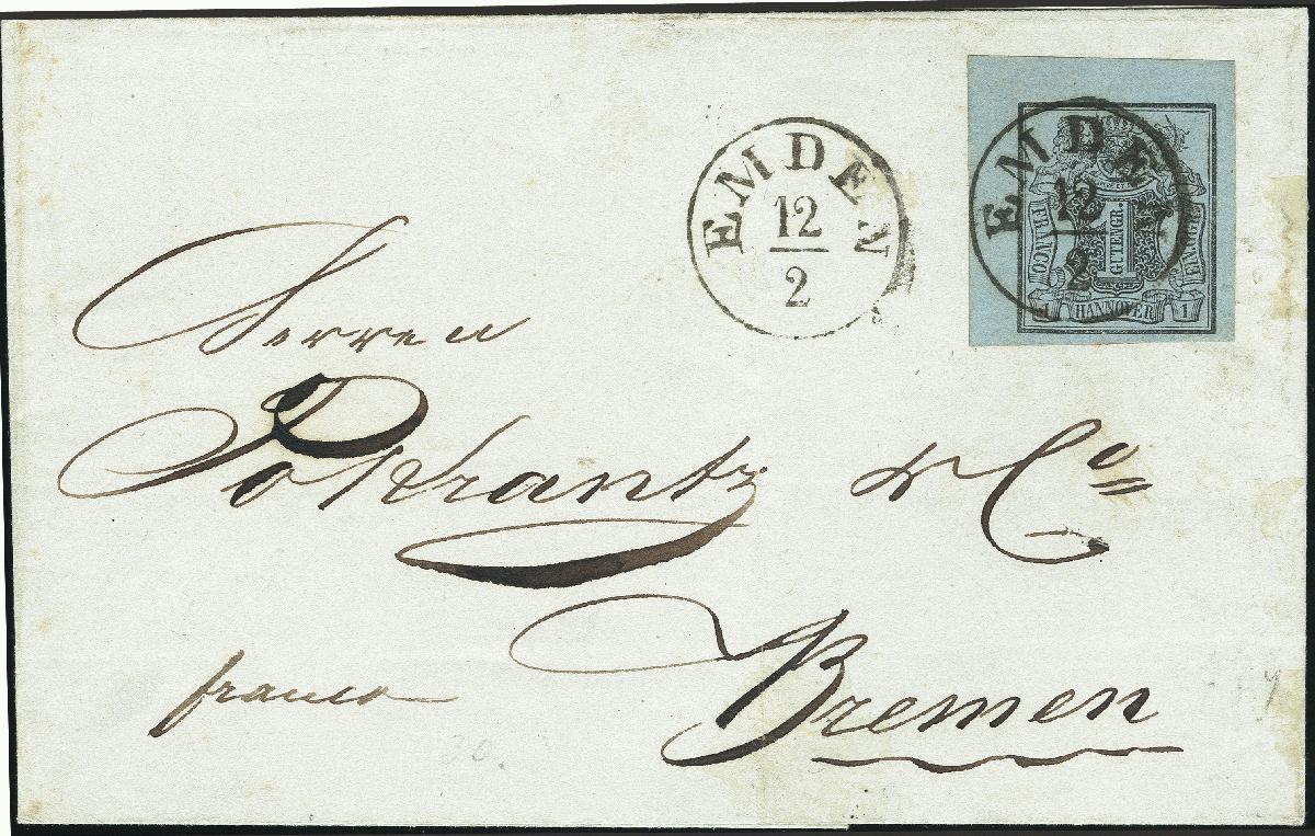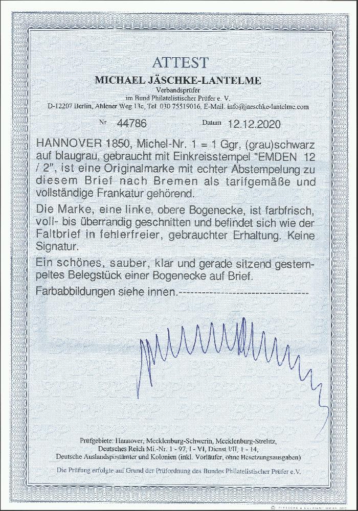 | Zusatzinformationen und Suchstichworte: | 376. Auktion Heinrich Köhler 19.-24. April 2021 Los 79 1 Gutegroschen schwarz auf graublau, linke obere Bogenecke, sehr schön farbfrisch und breit- bis überrandig geschnitten, mit klar auf- und nebengesetztem kleinen Einkreisstempel "EMDEN 12/2" (1851) auf kleiner Briefhülle nach Bremen; ein sehr schöner Brief in einwandfreier Erhaltung. Fotoattest Jäschke-Lantelme BPP (2020) Ausruf 200,00 EUR Zuschlag 2.100,00 EUR (aus der Sammlung Erivan Haub) |