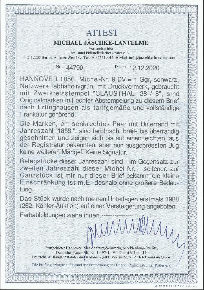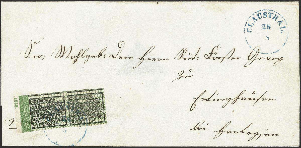 | Zusatzinformationen und Suchstichworte: | 376. Auktion Heinrich Köhler 19.-24. April 2021 Los 88 1 Gutegroschen lebhaftolivgrün genetzt im senkrechten Unterrandpaar, allseits breit- bis überrandig, links mit Teilen von 2 Nachbarmarken und im Unterrand mit Jahreszahl "1858", mit leicht und sauber aufgesetztem Doppelkreisstempel "CLAUSTHAL 28/8" auf Briefhülle nach Ertinghausen bei Hardegsen mit Ankunftsstempel. Sehr schöne Erhaltung; eine leichte Bugspur in der oberen Marke, die in einer alten Auktionsbeschreibung erwähnt wurde ist heute nicht mehr nachweisbar. Die Jahreszahl "1858" ist bei dieser Marke außerordentlich selten, auf Brief ist nur dieses eine Stück bekannt; darüber hinaus ist eine komplett erkennbare Jahreszahl aufgrund ihrer Stellung zwischen 2 Marken nur bei Randpaaren oder sehr breitrandigen Stücken, wie hier vorliegend, möglich. Signiert Metzer und Fotoattest Jäschke-Lantelme BPP (2020) Ausruf 800,00 EUR Zuschlag 1.200,00 EUR (aus der Sammlung Erivan Haub) |