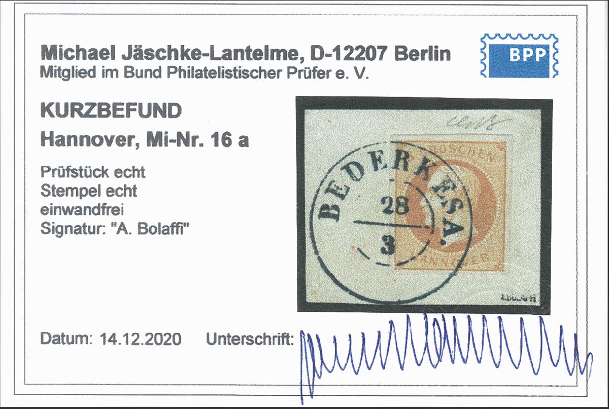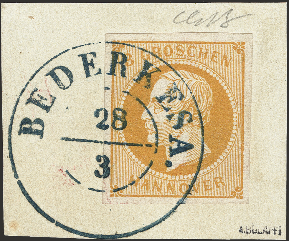 | Zusatzinformationen und Suchstichworte: | 376. Auktion Heinrich Köhler 19.-24. April 2021 Los 93 1859, 3 Groschen gelborange, sehr schön farbfrisch und allseits breitrandig mit ideal aufgesetztem großen Doppelkreisstempel "BEDERKESA 28/3" auf Briefstück, Luxus, signiert G. Bolaffi und A. Bolaffi, Kurzbefund Jäschke-Lantelme BPP Ausruf 80,00 EUR Zuschlag 380,00 EUR (aus der Sammlung Erivan Haub) |