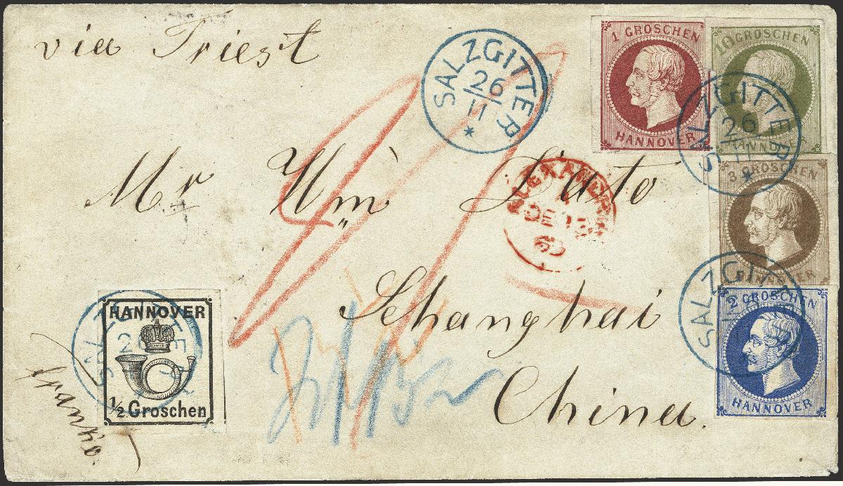 | Zusatzinformationen und Suchstichworte: | 376. Auktion Heinrich Köhler 19.-24. April 2021 Los 96 1861, 10 Groschen dunkelgrünlicholiv mit unterem Bogenrand zusammen mit 1 Groschen lilarot, 2 Groschen blau, 3 Groschen braun und ½ Groschen schwarz, alle farbfrisch und meist voll- bis breitrandig, lediglich die 1 Groschen rechts oben angeschnitten und diese und die 3 Groschen leichte Bugspuren, sonst - insbesondere die 10 Groschen - einwandfrei, alle sehr schön entwertet durch kleinen Einkreisstempel "SALZGITTER 26/11" auf Briefhülle über Triest, die 'Overland Mail' und Hongkong nach Shanghai. Der Brief ist portogerecht frankiert mit 3 Groschen Postvereinsporto, 3 Groschen österreichischem Seeporto bis Alexandria und 10½ Groschen Weiterfranko für die Strecke jenseits von Alexandria. Einer der bedeutensten Auslandsbriefe Hannovers mit einer außerordentlich seltenen Fünffarbenfrankatur, wir haben nur 2 weitere registriert. Jäschke-Lantelme BPP (2020) Ausruf 15.000,00 EUR Zuschlag 115.000,00 EUR (aus der Sammlung Erivan Haub) |