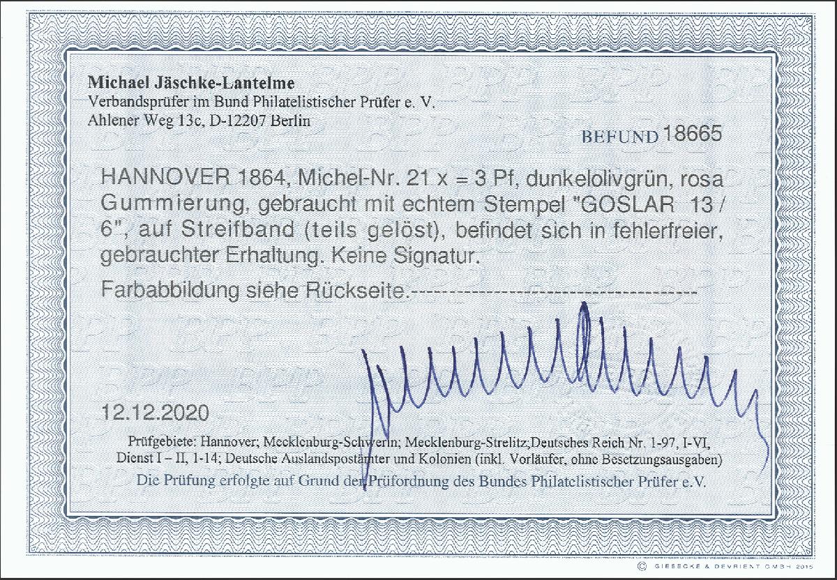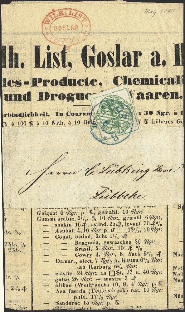 | Zusatzinformationen und Suchstichworte: | 376. Auktion Heinrich Köhler 19.-24. April 2021 Los 97 1864, 3 Pfennig grün in schönert tiefer Farbe und einwandfrei durchstochen, mit kleinem Doppelkreisstempel "GOSLAR 13/6" auf vollständiger Streifbandsendung nach Lübbeke mit rückseitigem Ausgabestempel vom nächsten Tag. Die Marke zur Kontrolle vom Drucksacheninhalt gelöst. Ein dekoratives Stück in einwandfreier Erhaltung. Fotobefund Jäschke-Lantelme BPP. Ausruf 400,00 EUR Zuschlag 400,00 EUR (aus der Sammlung Erivan Haub) |
