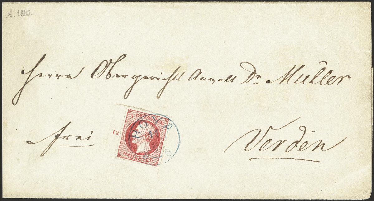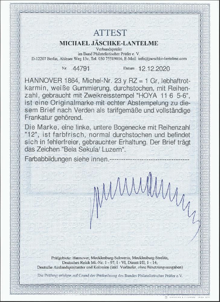 | Zusatzinformationen und Suchstichworte: | 376. Auktion Heinrich Köhler 19.-24. April 2021 Los 98 1864, 1 Groschen rosa, linke untere Bogenecke mit Reihenzähler "12", mit sauber aufgesetztem kleinen Doppelkreisstempel "HOYA 11/6" auf Briefhülle nach Verden mit Ankunftsstempel, Pracht, Fotoattest Jäschke-Lantelme BPP (2020) Ausruf 100,00 EUR Zuschlag 140,00 EUR (aus der Sammlung Erivan Haub) |