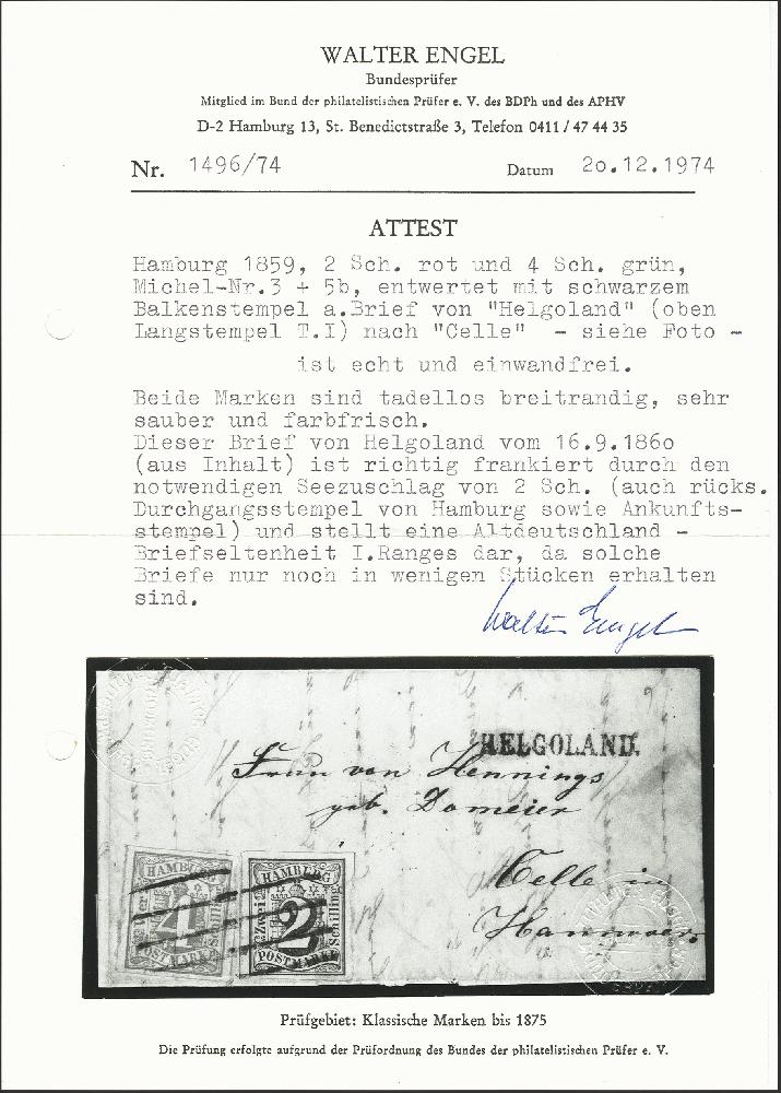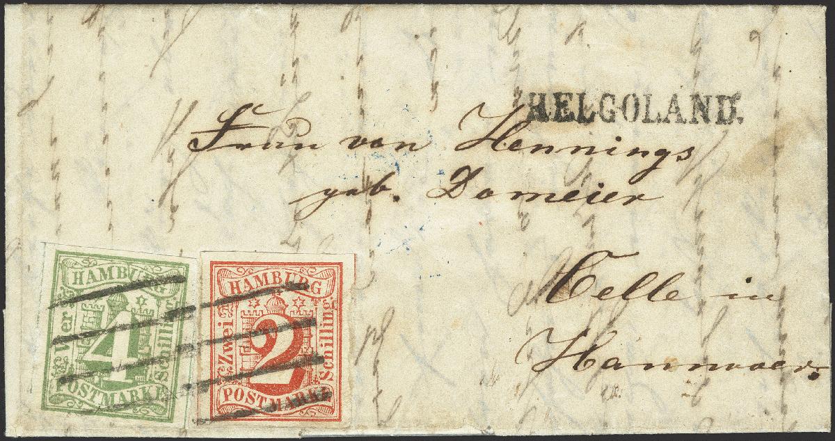 | Zusatzinformationen und Suchstichworte: | 376. Auktion Heinrich Köhler 19.-24. April 2021 Los 104 Hamburg 1859, 4 Schilling bläulichgrün und 2 Schilling orangerot, beide sehr schön farbfrisch und gut voll- bis meist breitrandig mit jeweils sauber aufgesetztem Strichstempel und nebengesetztem Langstempel "HELGOLAND." auf komplettem kleinen Faltbrief vom 16. September 1860 nach Celle in Hannover mit rückseitigen Durchgangsstempeln des Stadtpost- und hannoverschen Postamtes von Hamburg sowie Ankunftsstempel von Celle vom 19.9. Diese Frankaturkombination kommt nur während der Sommermonate vor während derer ein Seepostzuschlag von 2 Schilling erhoben wurde. Wir haben nur 3 weitere derartige Frankaturen auf Brief registriert, von denen sich einer im Besitz der Museumsstiftung Post und Telekommunikation befindet. Einer der schönsten und hochwertigsten Helgoland-Briefe in tadelloser Erhaltung. Fotoattest Walter Engel BPP (1974) Ausruf 15.000,00 EUR Zuschlag 34.000,00 EUR (aus der Sammlung Erivan Haub) |